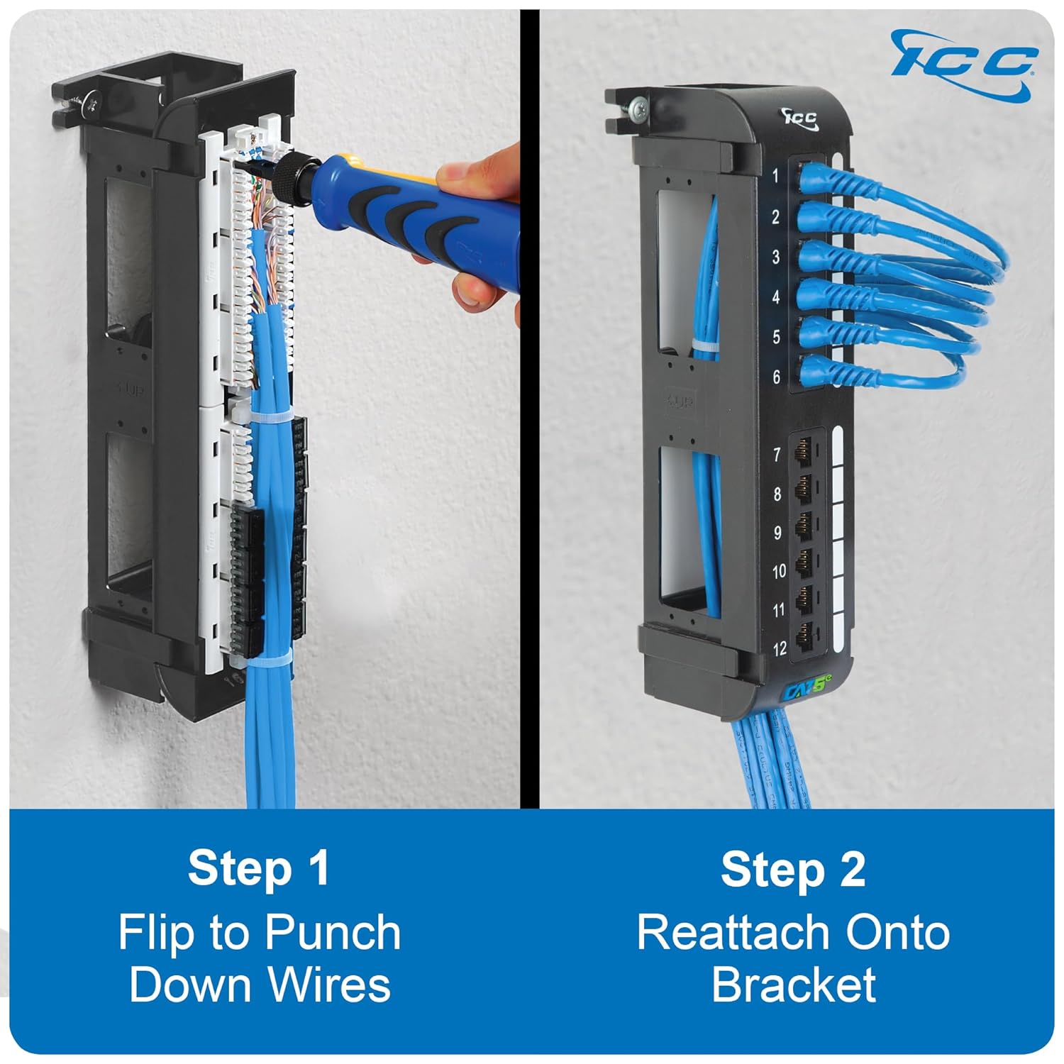 ICC CAT5e Patch Panel, UL Listed & PoE++ Rated Gigabit Applications, Wall Mount 12 Port Network Patch Panel with Rear 110 IDC Terminal Blocks and 89D Wall Mount Bracket, Black