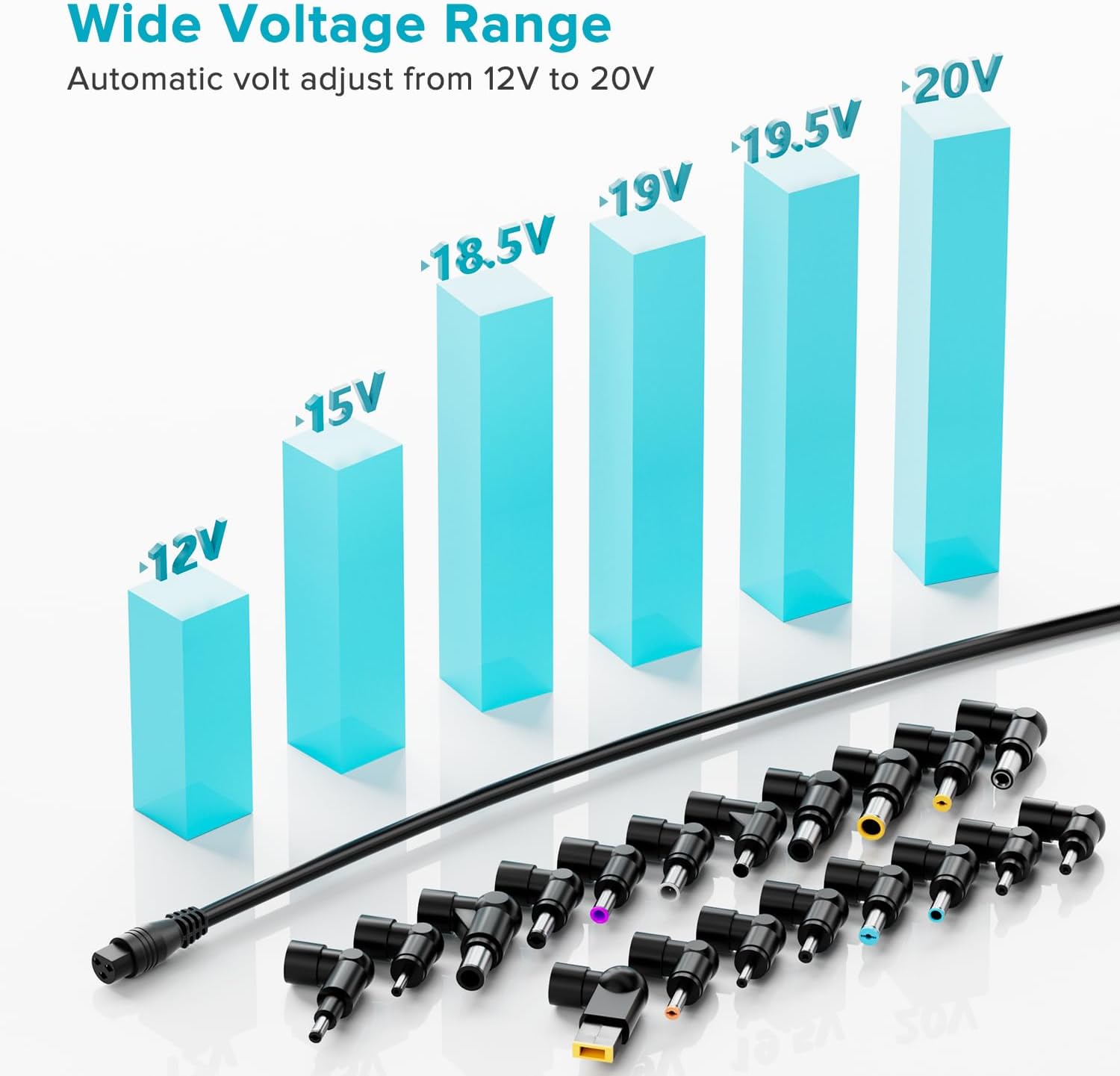 - WIDE OUTPUT VOLTAGE, 12V-20V - Input voltage: Worldwide 100-240V, 50 - 60Hz. Output Voltage: DC 12V, 15V, 18.5V, 19V, 19.5V, 20V, max 90W, compatible laptop ac dc power adapter within 90 watt. Different tips for different laptop brands & models. Do not charge laptops over 90W. Does not include USB C plug, not suitable for charging USB C laptops.Please confirm that your laptop model and charger specifications match our laptop power adapter