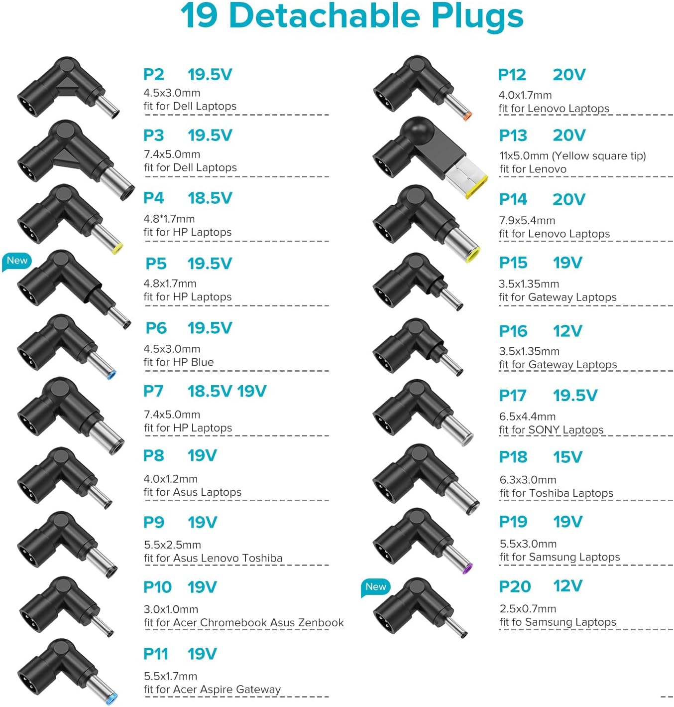- A Fantastic Space Saver: ZOZO Universal Laptop Charger 90W Laptop adapter with 17 pcs Tips works with most laptops chromebooks ultrabooks. Power your different brand laptops with one laptop power cord. This laptop charger & adapter replacing 90W 75W 65W 45W laptop AC Adapter computer cord, from 12 volt to 20 volt computer charger.Does not include USB C plug. Please check and confirm that your laptop power plug type is included in our plug list before purchasing