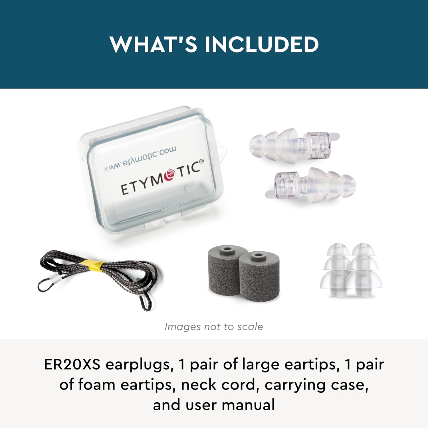 Etymotic ER20XS ETY Earplugs Set - High-Fidelity Hearing Protection - Up to 20 dB Sound Reduction - Reusable - Includes 1 Pair of Large, Standard, and Foam Eartips, Neck Cord & Case