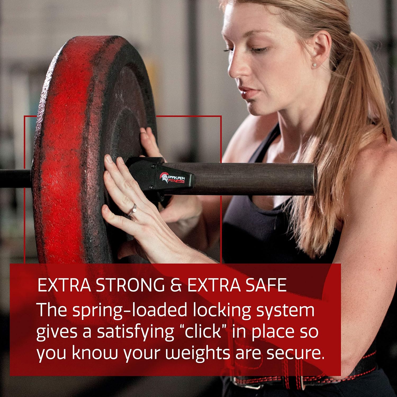 - SAFE – Each of the weight clamps for Olympic bars have a spring-loaded lock so the clip snaps into place with a load "click" to let you know it is in place and secure. Each barbell collar features a rubber strip within for reinforced grip on the bar.