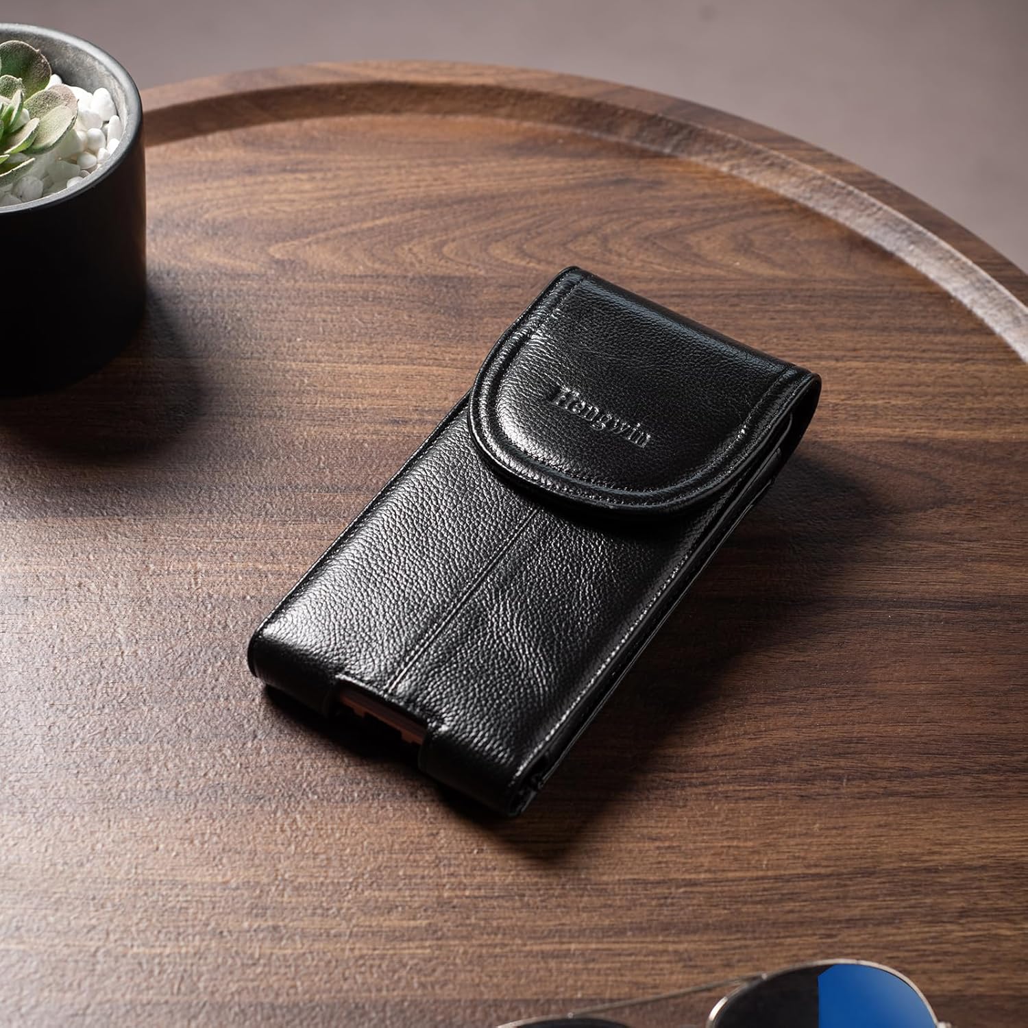 Hengwin Genuine Leather Cell Phone Holster for Belt Men, Vertical Phone Holder Belt Pouch Fits for iPhone 15 Pro Max 14 Pro Max 13 Pro Max Samsung Galaxy S24 Ultra Note9 Case with Belt Clip (Black)