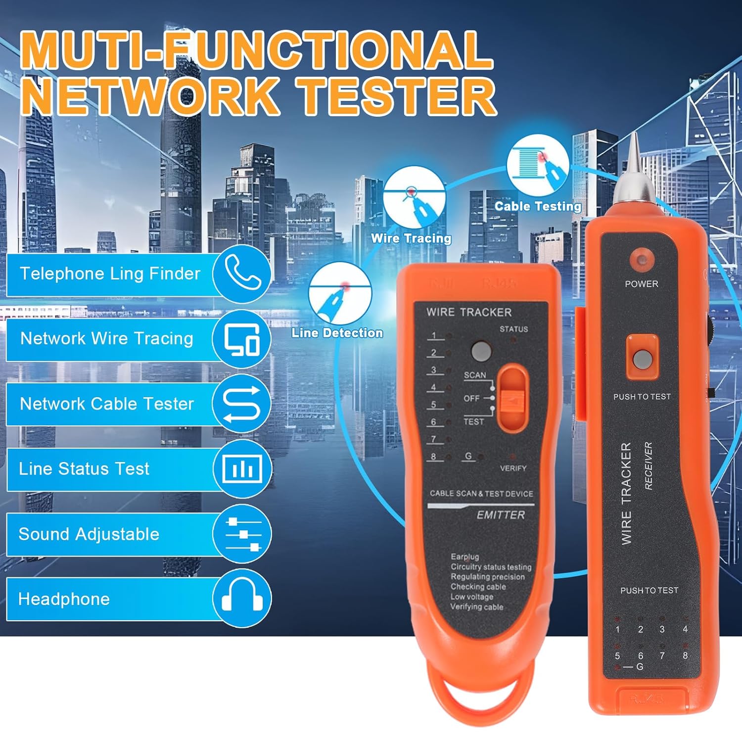 - Headset to fit the noisy environment.In a noisy environment, you can put on the earphones to accurately find the target cable through comparing the strength of "beep beep" sound. Adjust the volume knob to make the volume proper and avoid being interfered. At night or in a dark environment, you can turn on the illuminating lamp, which can be helpful during operating.