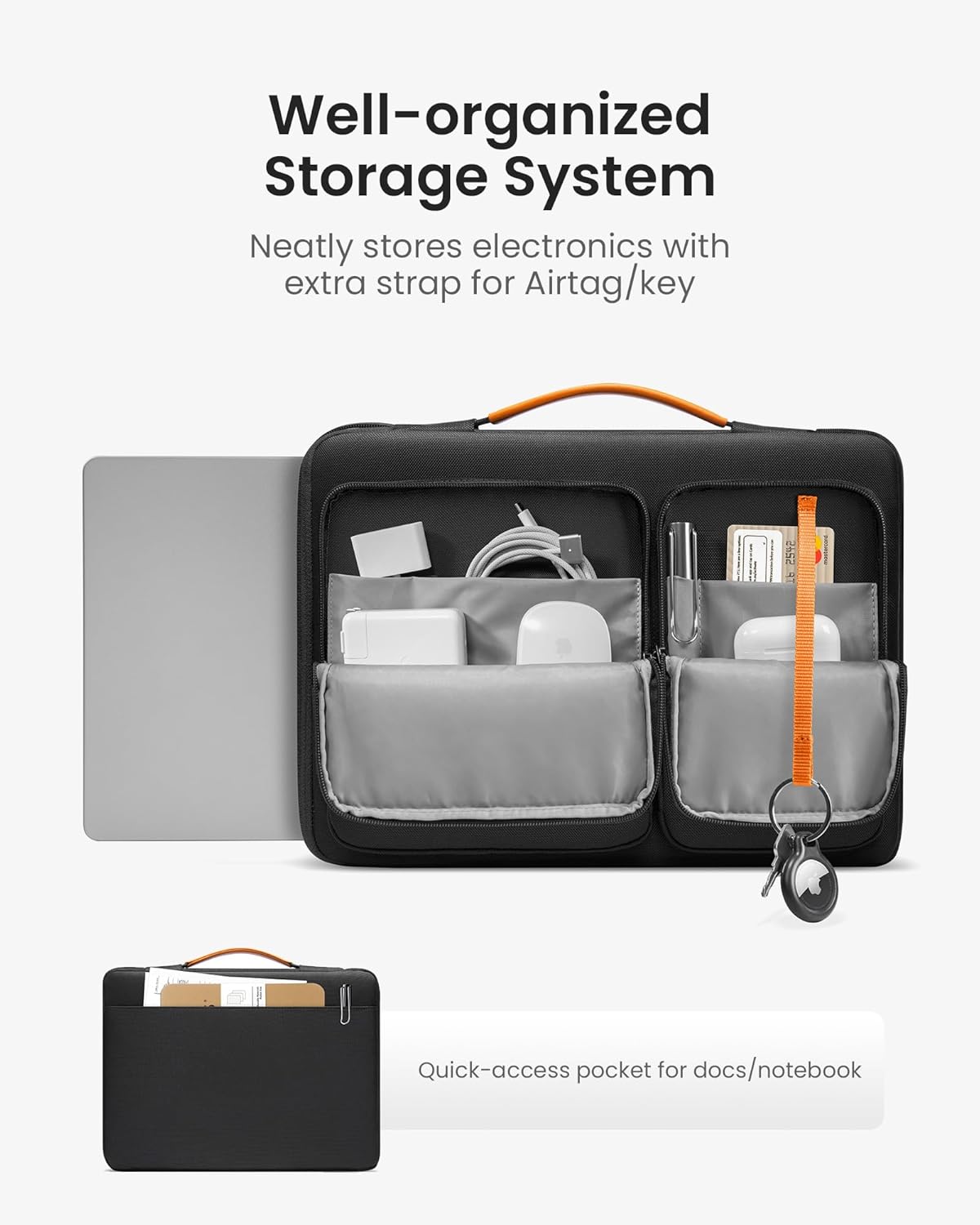 - Smart Tri-compartment Storage System: The laptop carrying case has two separate compartments with several small pockets and a strap for Airtag or key. It can keep your electronic accessories, such as charger, cable, USB hub, Kindle, etc., stay organized. In addition, a hidden pocket on the back allows you to store your personal belongings for easy access while remaining secure