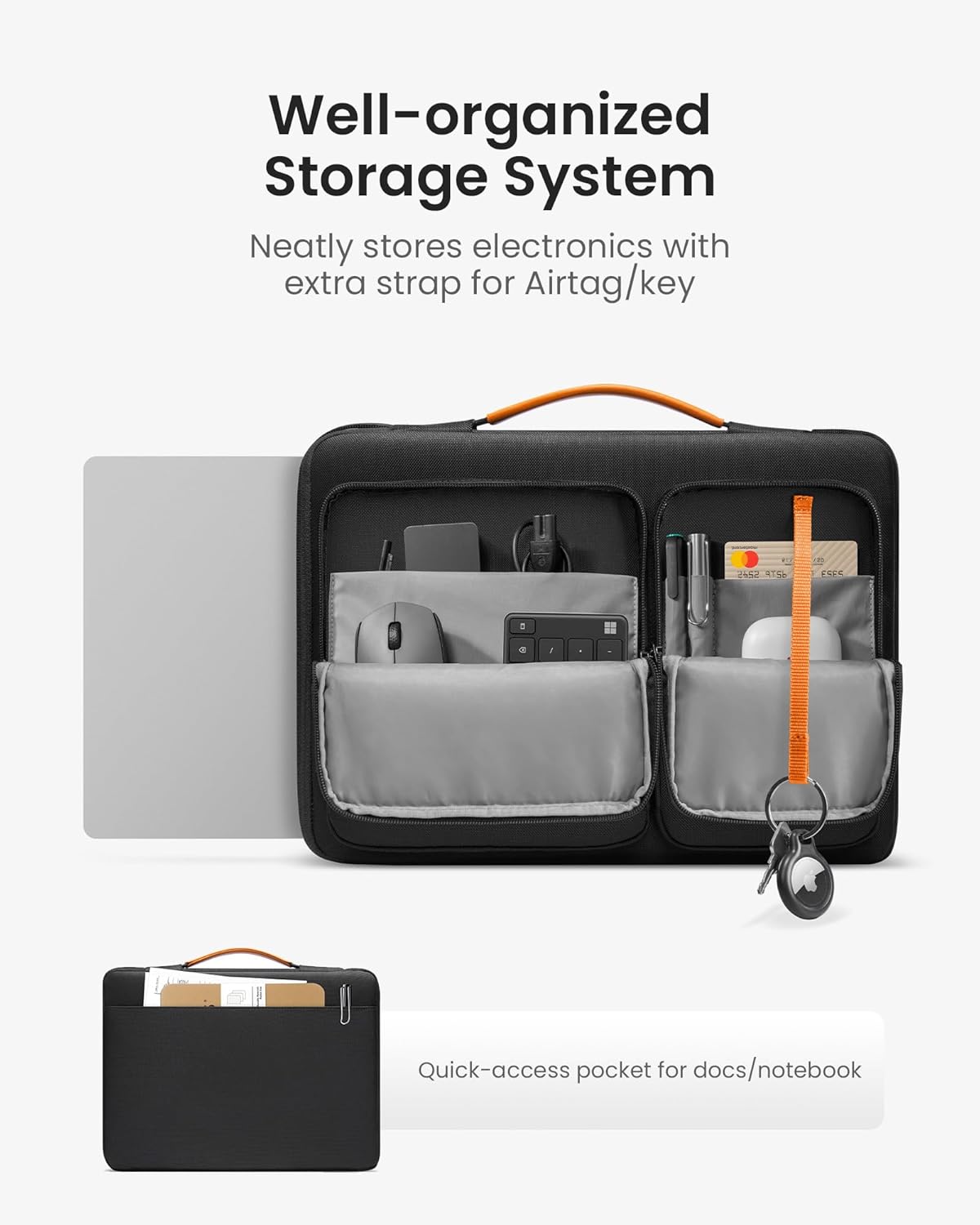 - Smart Tri-compartment Storage System: The laptop carrying case has two separate compartments with several small pockets and a strap for Airtag or key. It can keep your electronic accessories, such as charger, cable, USB hub, Kindle, etc., stay organized. In addition, a hidden pocket on the back allows you to store your personal belongings for easy access while remaining secure