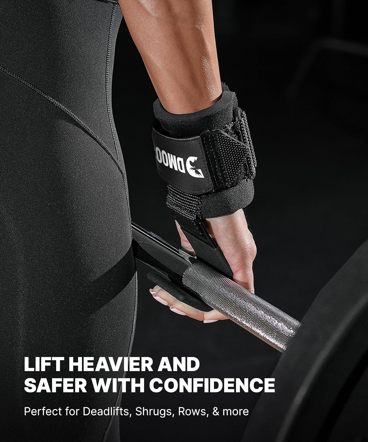 - NO MORE GRIP FATIGUE DURING LIFTS: DMoose Wrist Hooks for weightlifting feature a non-slip grip that locks your hands to the bar, preventing grip fatigue during heavy lifts. Gym Grips focus on pushing more weight without distractions. Your strength is the only limit!