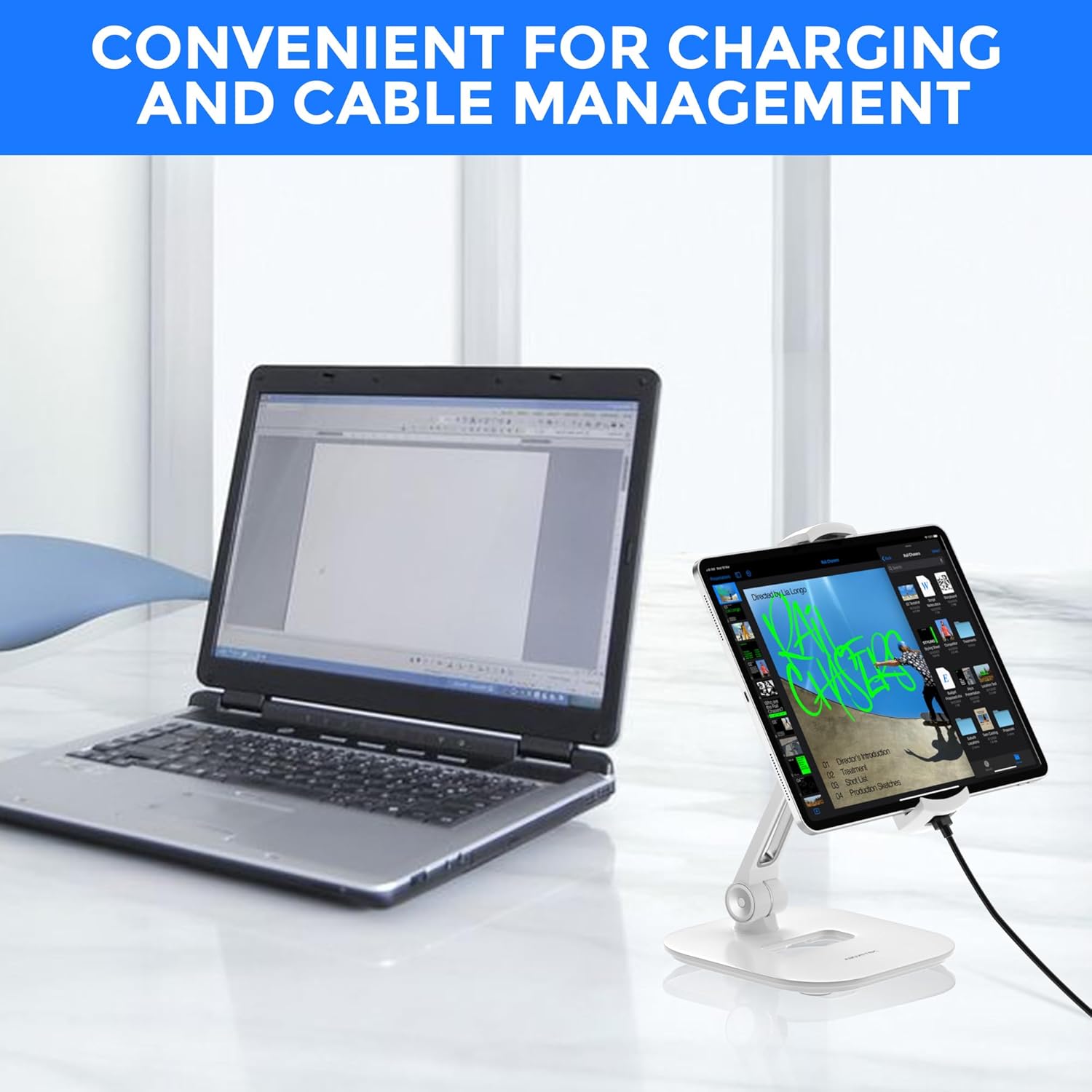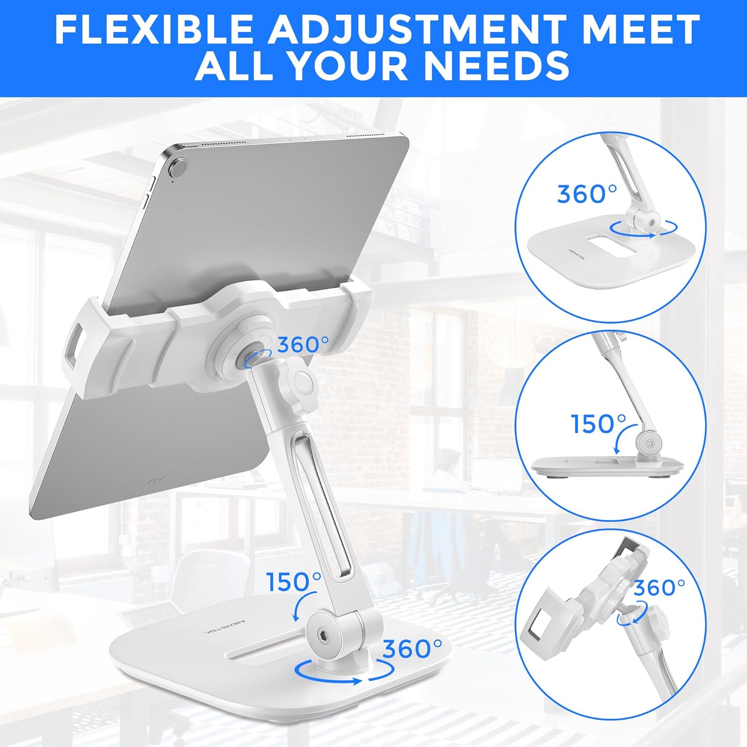 AboveTEK Tablet Stand Holder, Stylish Aluminum iPad Stands, Foldable 360° Swivel iPad iPhone Table Stand Holder fits 4-11" Tablets/Smartphones for Kitchen Bedside Office POS Showroom Reception (White)