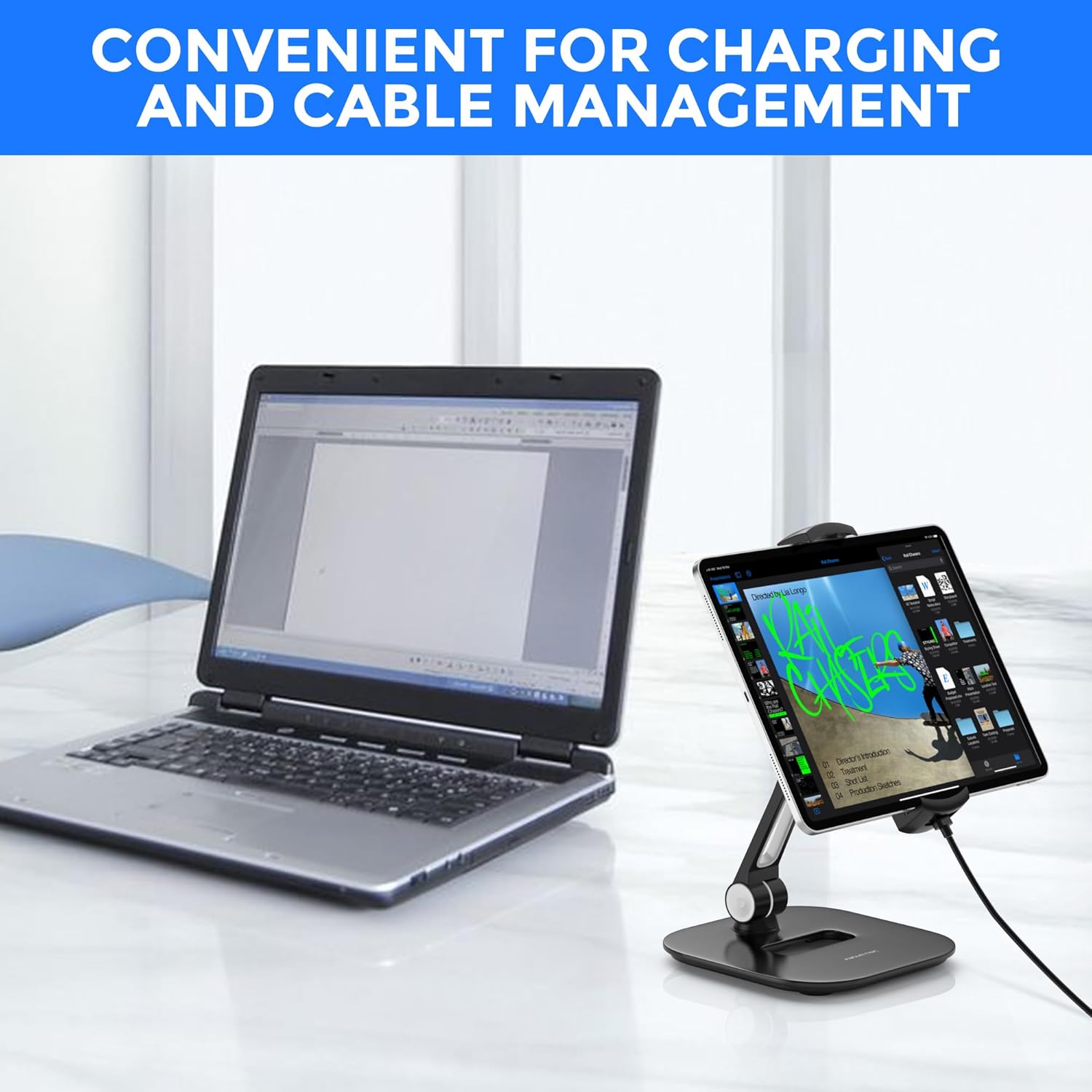- Considerate layout – Simple and ergonomic shape echo with your sleek tech gadgets in harmony, featuring special cutouts on both the holder and the base bottom for housing power cord – a true tablet computer stand that pays great attention to details for its users