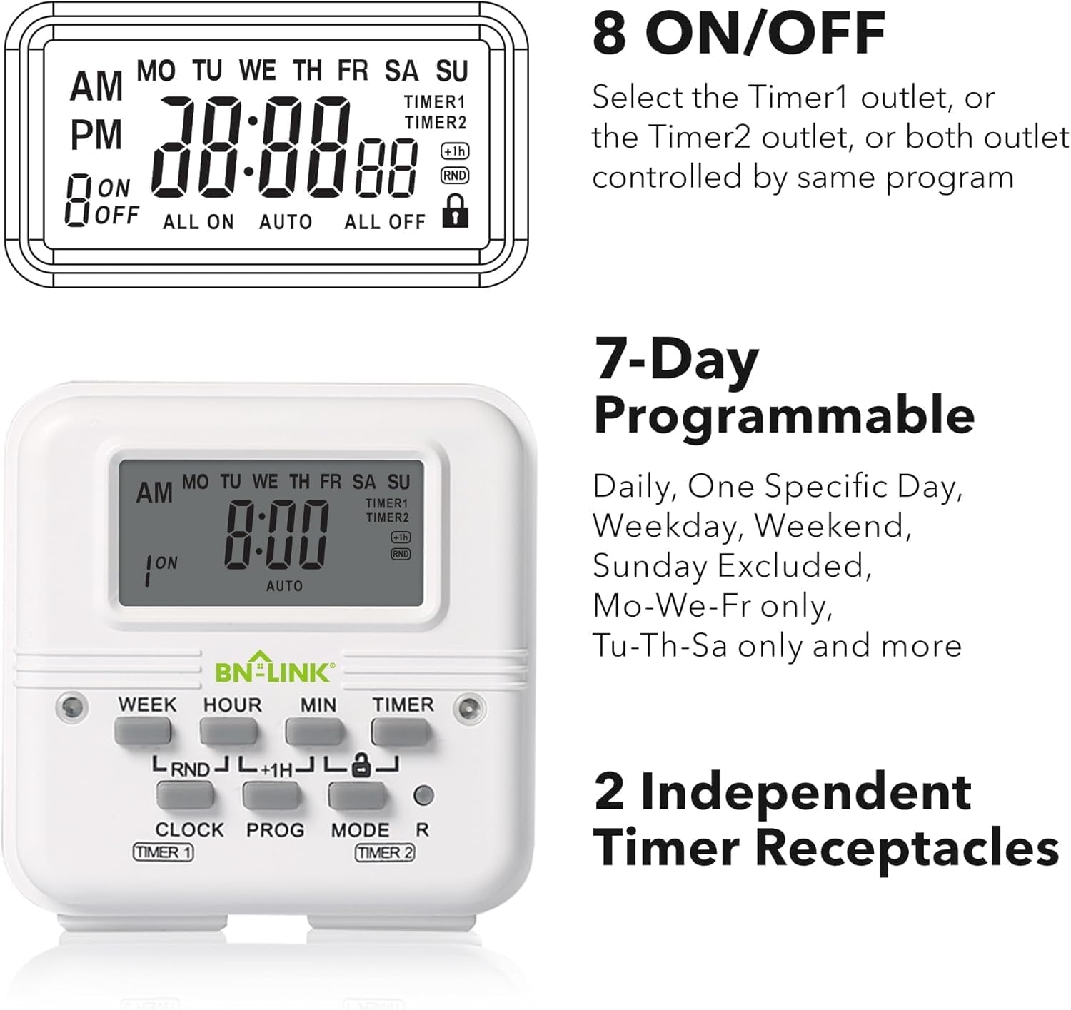 - 【2 Outlets with Independent Control】The BN-LINK timer features two control buttons (Mode1 and Mode2), allowing you to manage each outlet independently. You can also sync both outlets to follow the same schedule when needed.