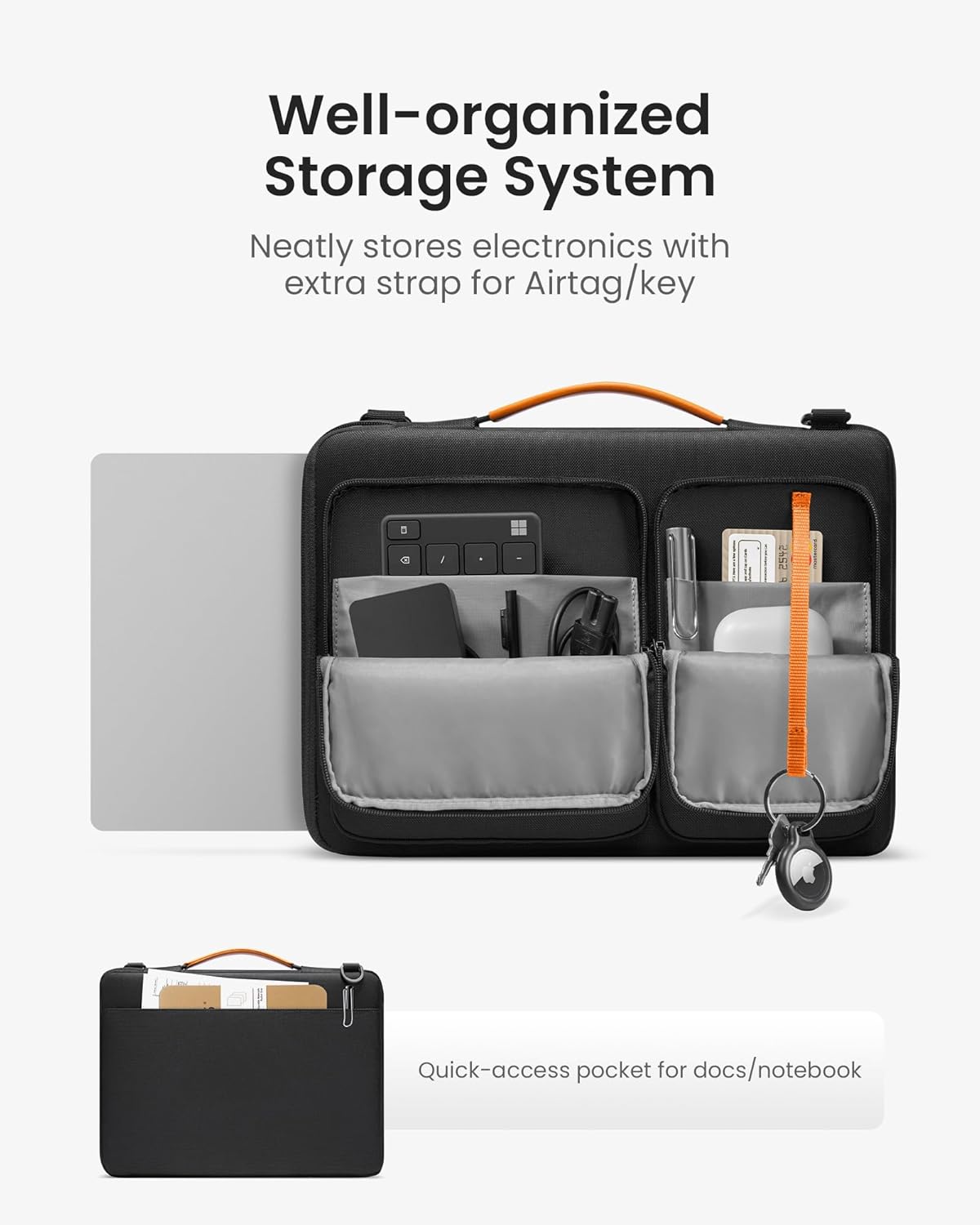 • Smart Tri-compartment Storage System: The laptop case has two separate compartments with several small pockets and a strap for Airtag or key. It can keep your electronic accessories, such as charger, cable, USB hub, Kindle, etc., stay organized. In addition, a hidden pocket on the back allows you to store your personal belongings for easy access while remaining secure