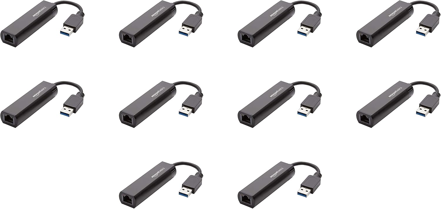 Amazon Basics USB 3.0 to 10/100/1000 Gigabit Ethernet Internet Adapter, 10-Pack, Black
