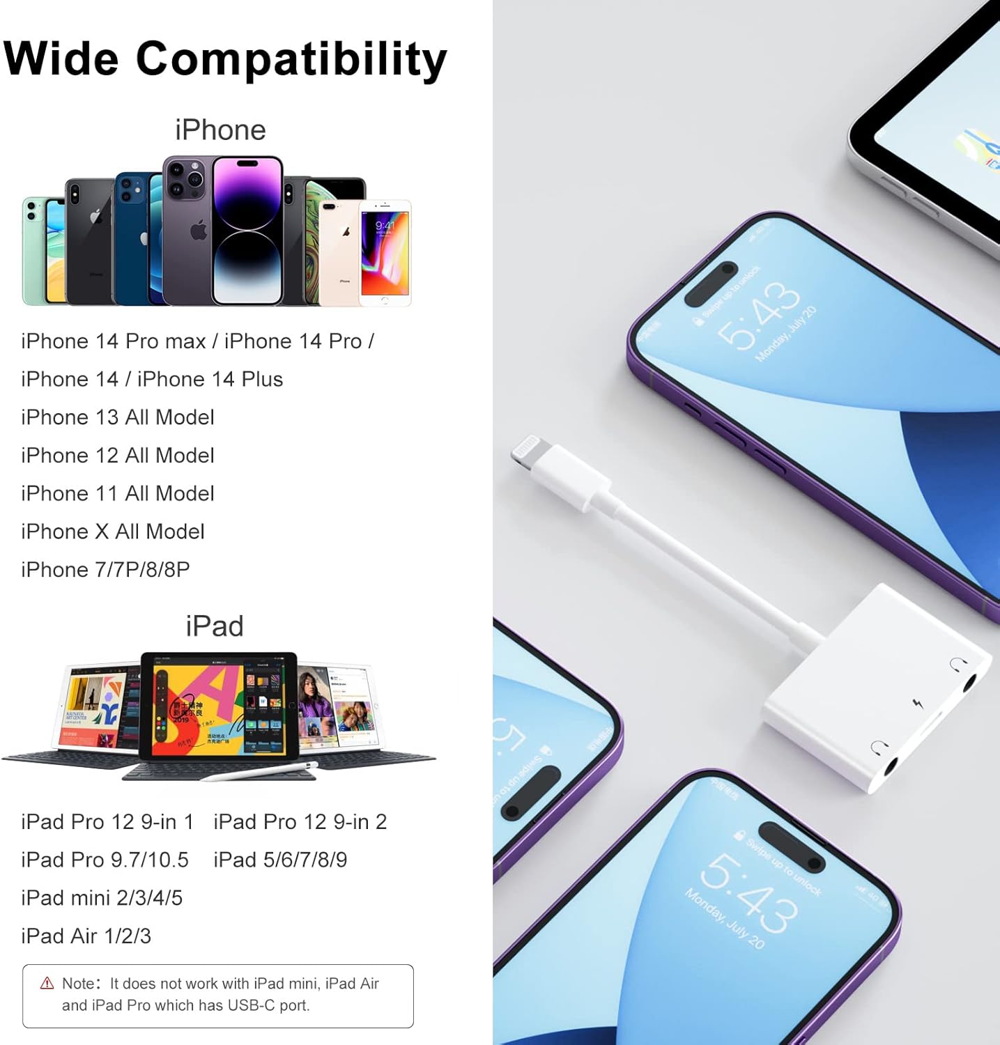 - 【Widely Compatibility】The iPhone headphone jack adapter support all your favorite phone devices, compatible with iPhone 14/ 14 Plus/ 14 Pro/ 14 Pro Max/ 13 mini/ 13/ 13 Pro/ 13 Pro Max/ 12 mini/ 12/ 12Pro/ 12 Pro Max/ 11/ 11 Pro/ 11 Pro Max/ XS Max/ XS/ X/ XR/ 8 Plus/ 8, 7,and Pad, no need APP, plug and play. ( Note: Not compatible with iPhone 15, 16 series and iPad with USB C port )