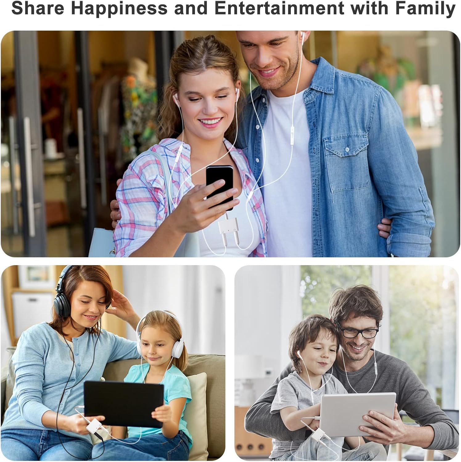 - 【Upgrade Design】 This 3 in 1 headphone splitter supports dual 3.5mm earphones working at the same time, it is designed for lovers, good friends, families to share happiness and entertainment. ( Note: Not compatible with iPhone 15, 16 series and iPad with USB C port )