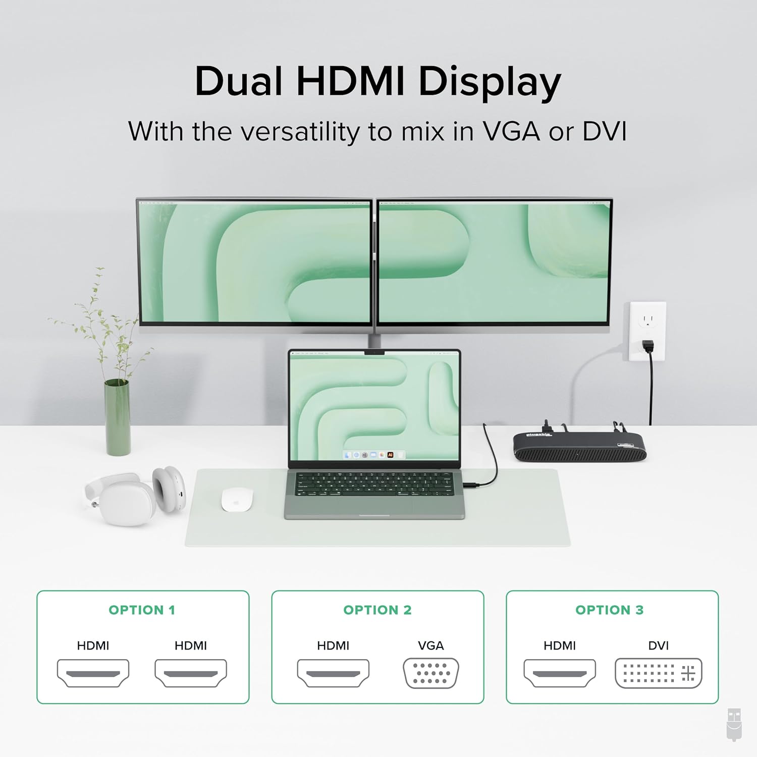- Dual HDMI Displays: Docking station dual monitor supports 2x displays up to 1920x1200 @ 60Hz refresh rate even if your computer only supports one output like an M1, M2, or M3 Mac. First output is HDMI, second output can support HDMI, DVI, or VGA display with included adapters