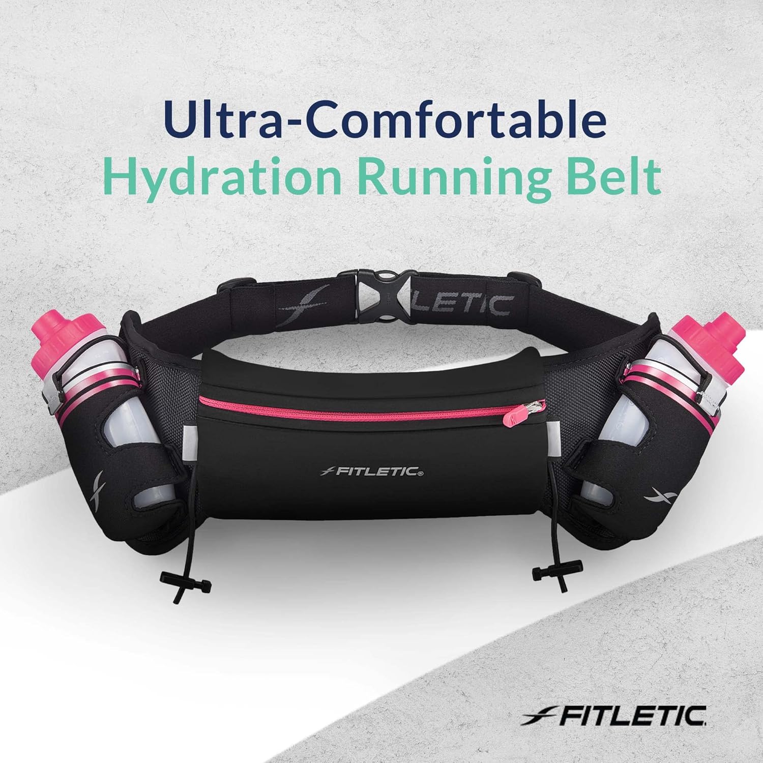 Fitletic Hydration Running Belt with Water Bottles for Men & Women – 2 Quick Flow 8oz Running Water Bottles, Patented Bounce Free Design, Water Resistant Pouch Fits All Phones – Hydra 16