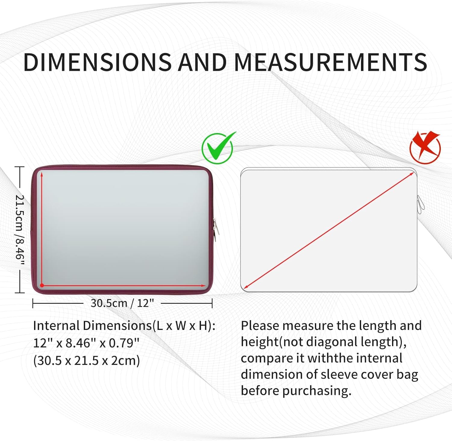 - APPLICABLE SIZE & MODEL:The 11"-11.6" case is a universal model for most 11" MacBook Air/Laptop/Tablet/Notebook/Chromebook. External Dimensions(L x W x H): 12.40" x 8.86" x 0.79"; Internal Dimensions(L x W x H): 12.01" x 8.46" x 0.79". If you especially need a snug fit or a loose fit, please compare the actual dimensions of your laptop with the internal dimensions of the sleeve, and make sure those are smaller than the internal dimensions, the more similar, the more fit.