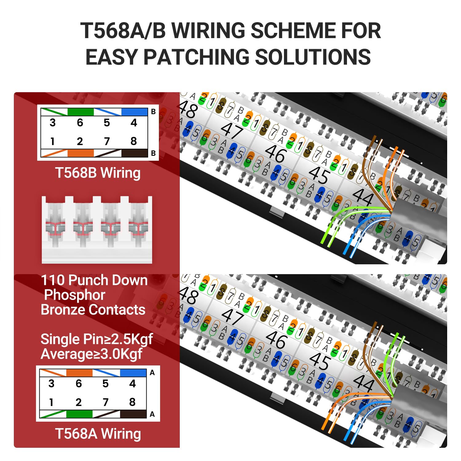 - T568 A&B Wiring color coding, written-on label and numbered ports on the back and front for easy Installation and identification