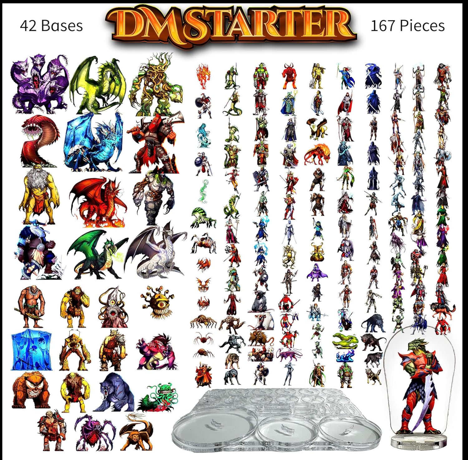 - Curated 167-piece complete collection - This dnd starter set includes 30 small, 100 medium, 15 large, and 12 giant miniatures with 40 bases (1", 2", 3" rounds plus flying bases)