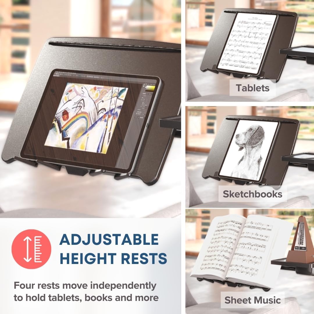 - FITS MOST DEVICES & TILTS 0°–70° FOR ERGONOMIC VIEWING – Holds notebooks up to 16″ wide (5 lb max), plus tablets, sketchpads, books, or documents. Tilts from flat to 70 degrees for ideal posture, whether sitting, reclining, or lying down. Includes safety bungee to secure your device at any angle. Adjusts quickly between seated and standing positions, making it a versatile mobile workstation for home or office.