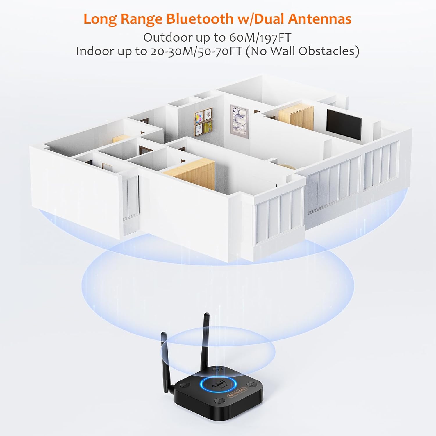 - 【DUAL ANTENNAS&LONG RANGE】With dual antennas and class 1 Bluetooth technology, the 1Mii B06 Pro Long Range Bluetooth receiver can achieve a range of up to 197ft (60m) line-of-sight in the open air and up to 50-70ft (20-30m) indoors(without obstacles). NOTE: operation range can be affected by Wi-Fi routers or antennas on the stereo receiver, etc.