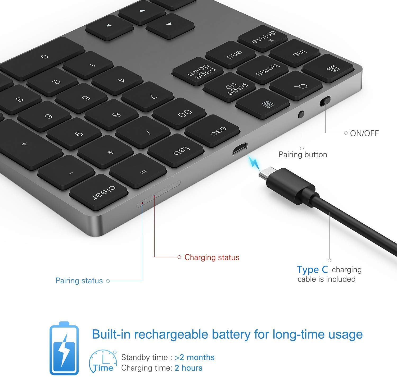 Bluetooth Number Pad, Lekvey Aluminum Rechargeable Wireless Numeric Keypad Slim 34-Keys External Numpad Keyboard Data Entry Compatible for Macbook, MacBook Air/Pro, iMac Windows Laptop Surface Pro etc