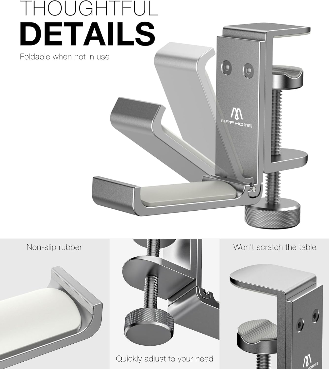 - Foldable Design Saves Space – Stay Neat, Stay Clear: The foldable headset hanger tucks cleanly under your desk to free up desktop space and improve cable management. When not in use, the hook folds up flush to avoid sticking out or blocking legroom.