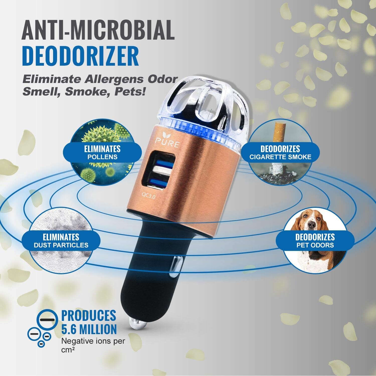 Car Air Purifier 3in1 Premium Stainless Steel Air Filter Ionizer w/Dual USB Quick Charge 3.0 USB-Eliminate Allergens Odor Smell, Smoke, Pets, Pollen Mold Bacteria w/Anti-Microbial Deodorizer (Bronze)