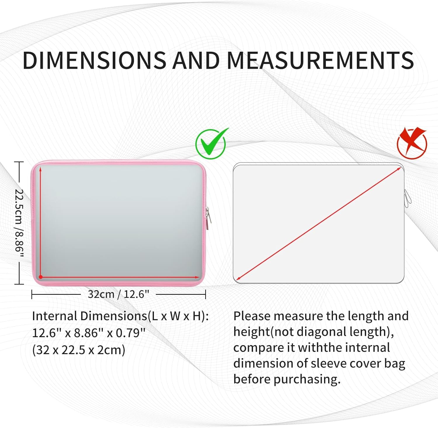 - NOTICE: The [13"] sleeve Specially Compatible with 13.3" MacBook Air Pro A3240, A3113, A2681, A2337, A2338, A1932, A2179, A1989, A1706, A1708, A2159, A2179, A2251. Internal Dimensions(L x W x H): 12.60" x 8.86" x 0.79". If your laptop is not among these models,or you especially need a snug fit or a loose fit, please compare the actual dimensions of your laptop with the internal dimensions of the sleeve, and make sure those are smaller than the internal dimensions, the closer, the more snug fit.