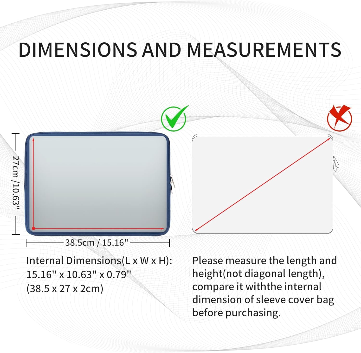 - APPLICABLE SIZE & MODEL:The 15.6" case is a universal model for most 15.6" Laptop/Tablet/Notebook/Chromebook. External Dimensions (L x W x H): 15.75" x 11.91" x 0.98"; Internal Dimensions(L x W x H): 15.16" x 10.63" x 0.79". If you especially need a snug fit or a loose fit, please compare the actual dimensions of your laptop with the internal dimensions of the sleeve, and make sure those are smaller than the internal dimensions, the more similar, the more fit.