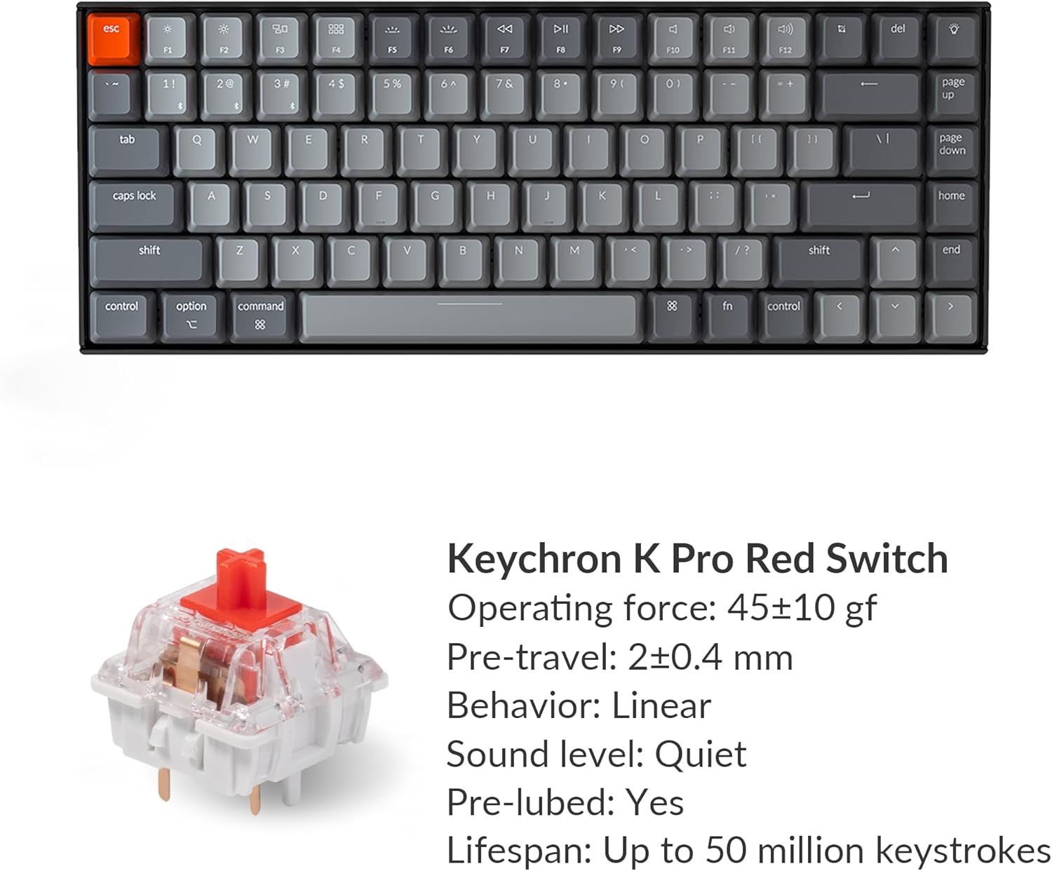 - With the Keychron K Pro Mechanical Red switch providing unrivaled linear responsiveness with up to 50 million keystroke lifespan. Charming white LED backlight with elegant keycap legends helps to type in dime environment, you can also choose static white backlight mode.