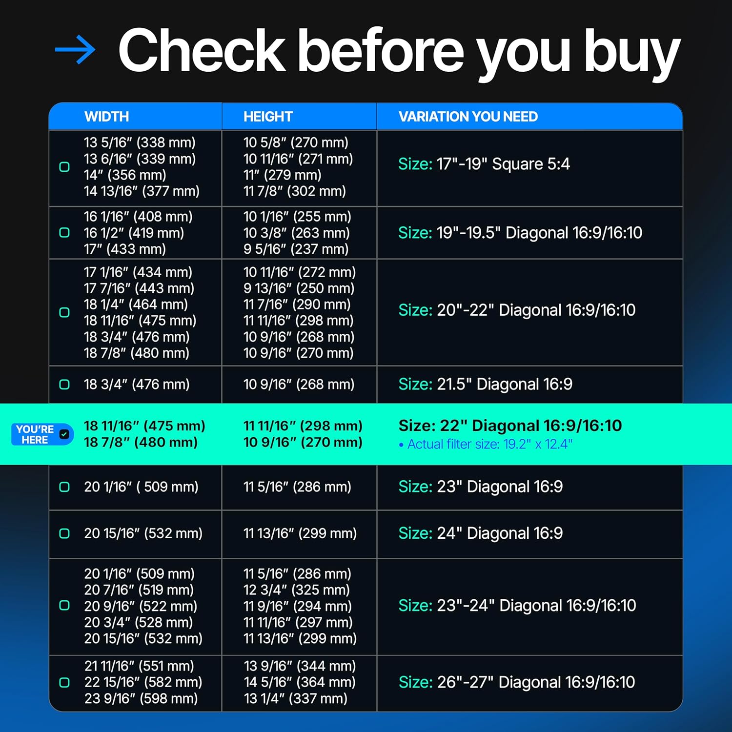 - Ideal Fit: Privacy screen protector fits screens sizes of 22". Actual filter size: Width: 19.3 inches (490mm), Height: 12.5 inches (317mm). The filter enhances visual clarity and protects the eyes