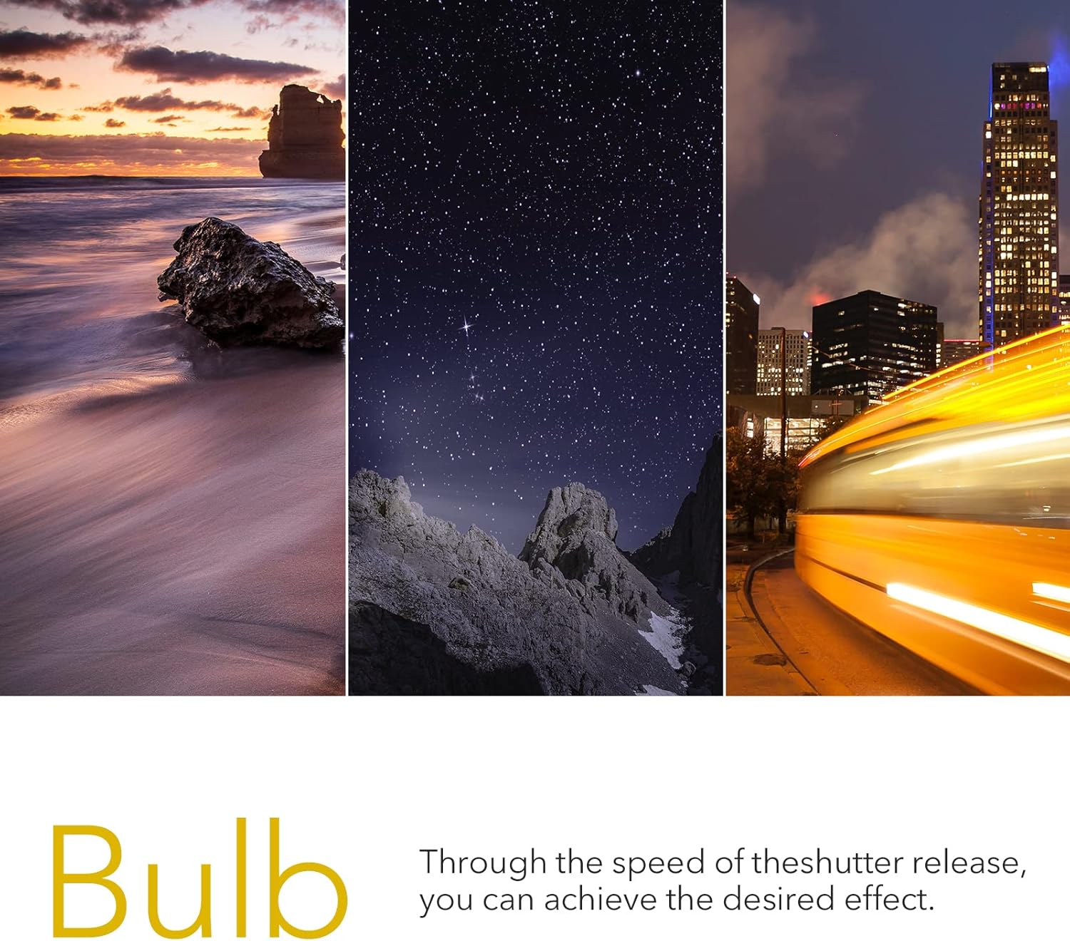 - With LCD screen, 4 modes for Shutter Release Control – S (instant single shooting), C (continuous shooting), B (bulb exposure) and 2S (2 seconds delay); 5 settings for Timing Control – DELAY (self timer), LONG (long time exposure timer), INTVL (interval timer), N (number of exposures) and BKLN (auto bracketing timer to shoot multiple exposure HDR images).