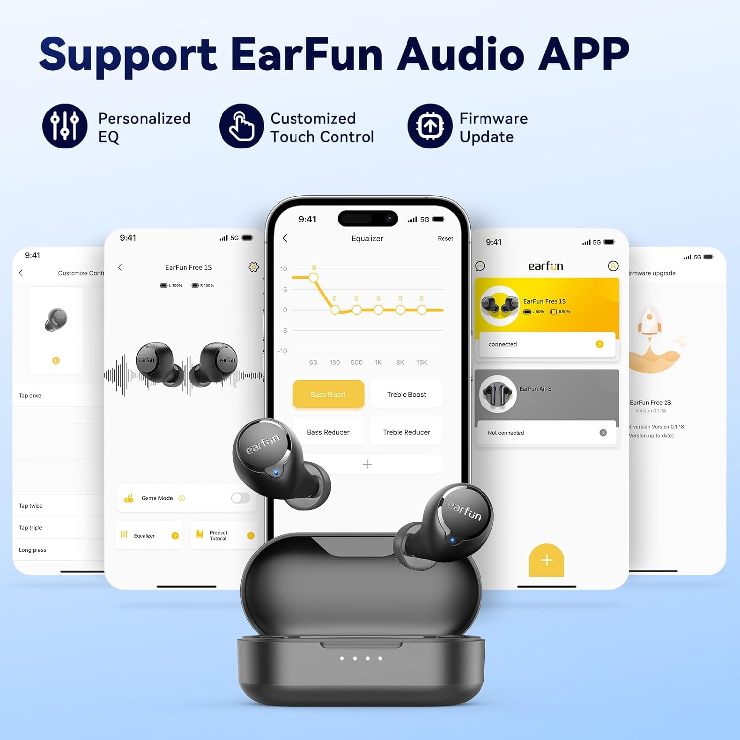 - EarFun App for Tailoring Sound. Download the EarFun App, more personalized settings and features can be found here, such as multi-EQ adjustment for your preference, customized touch control, battery display, and more. And you can turn on the game mode on the App to get a lower latency experience.