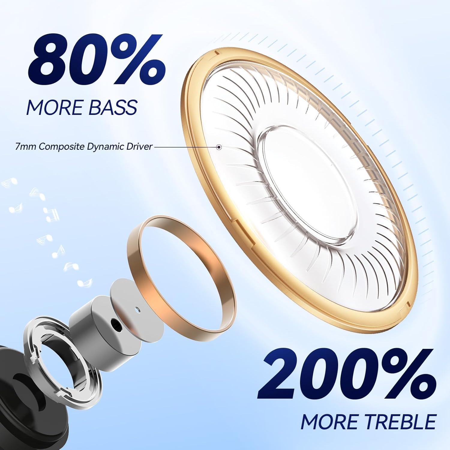 - More Bass & High-Quality Stereo Sound. Powered by 7mm composite dynamic drivers, the wireless earbuds present a powerful, balanced and wide sound range with deep bass, stunning treble and clear mid, connecting you with the music world.