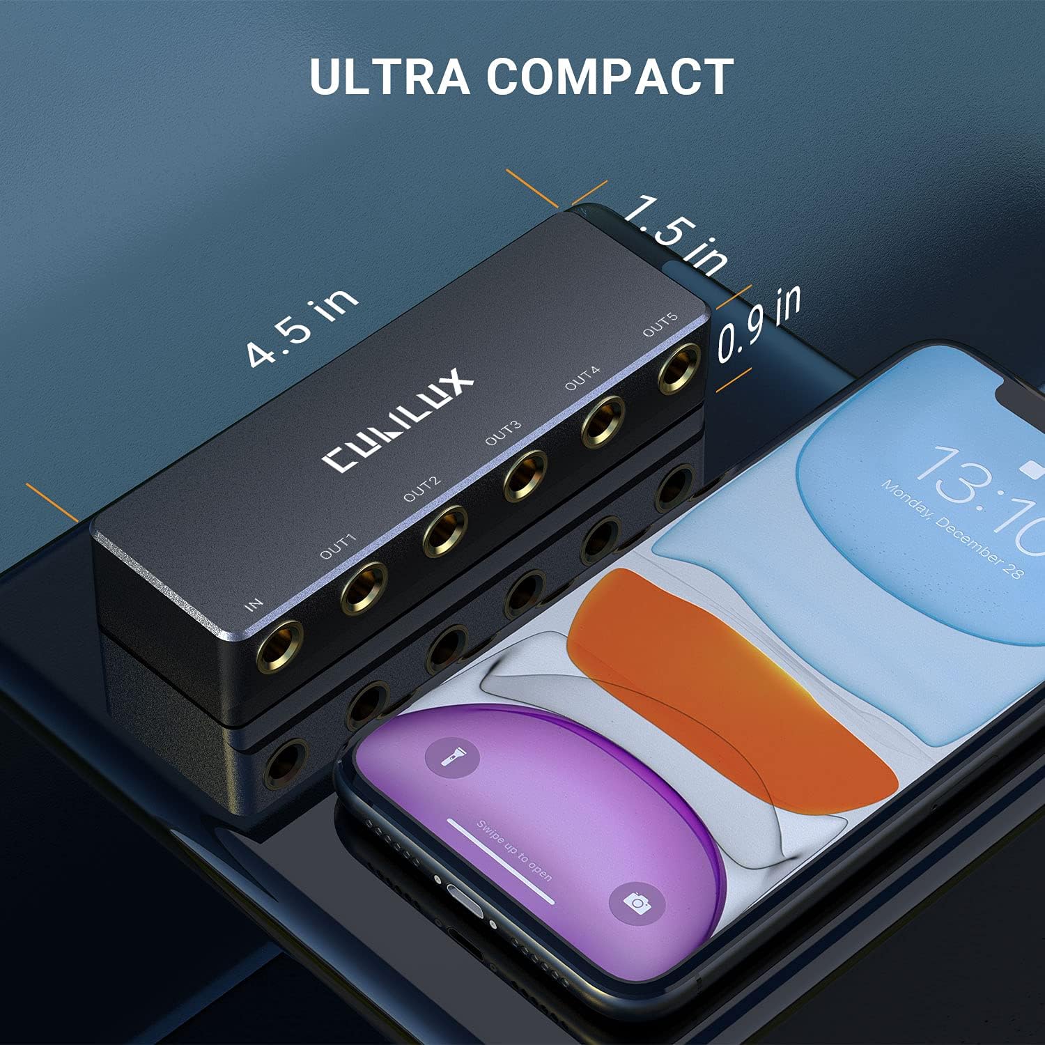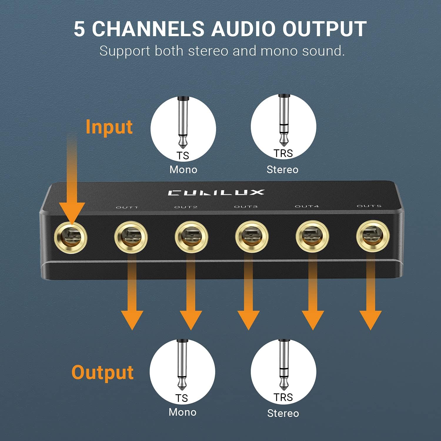 - [Split Audio Feed to Five Ways Output] - Equipped with 5 1/4" TS/TRS output jacks, this audio splitter distributes a single audio feed in Mono/Stereo mode to up to 5 channels, including powered speakers, amplifiers, monitors, headphones, etc., essential for live performances, studio recording or podcasting.