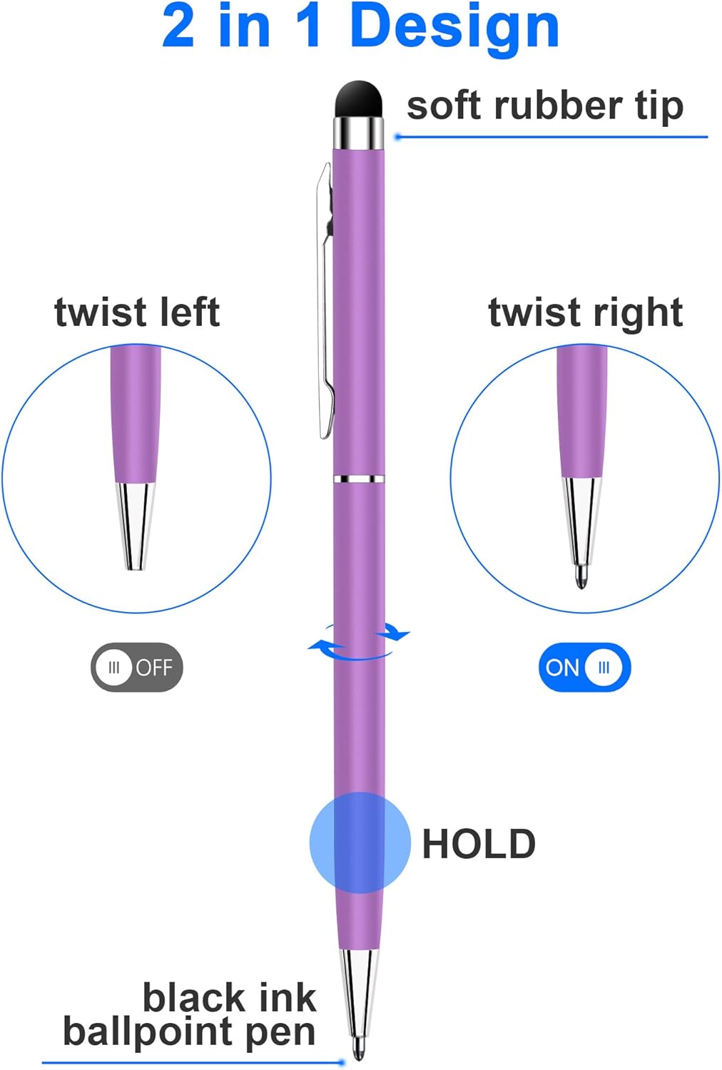 - 2 IN 1 DESIGN STYLUS PENS: One side contains sensitive stylus for touch screens. Twist the stylus pen body to extend the black ink ballpoint pen on the other side for convenient writing. Smooth and long lasting ink flow.