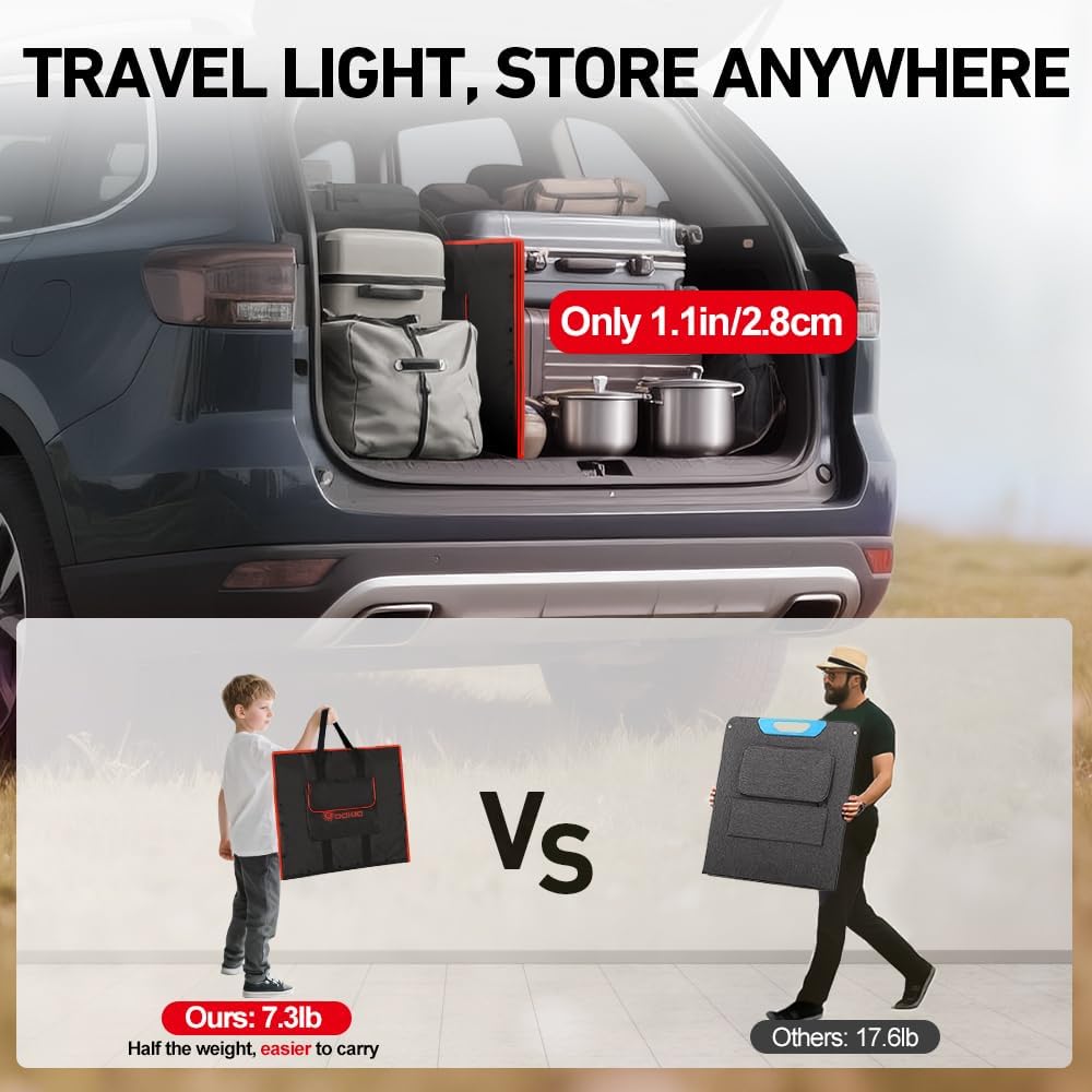 - 【COMPACT & TRAVEL-READY】 Folds down to 19.3x20.9x1.1in and just 7.3lb—light enough to pack, carry, and set up solo. Perfect for RVs, vans, camping, or backup power.