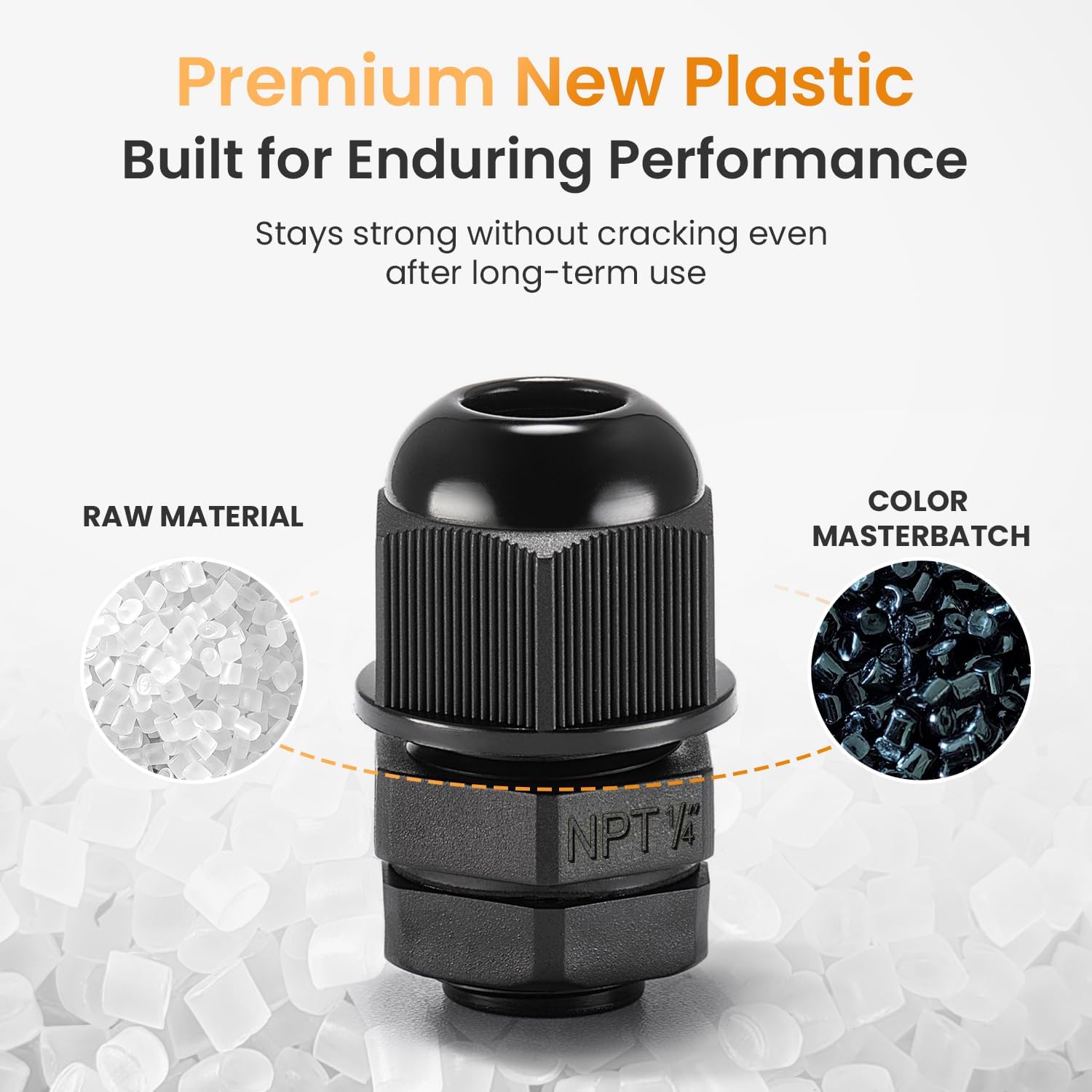 - Premium New Material: Our cable gland is crafted from high-grade, RoHS- and REACH-compliant new plastic. It withstands long-term use without cracking from UV exposure, stress, or harsh environments. This ensures you won’t worry about hidden damage or unexpected replacements, lowering your Total Cost of Ownership