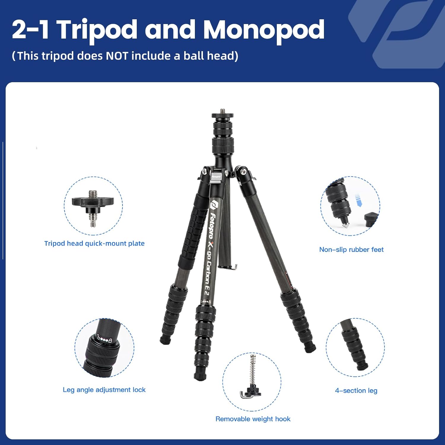Fotopro 59” Carbon Fiber Travel Tripod, 2 in 1 Lightweight Monopod Tripods, Professional Compact Tripod for DSLR Camera, Load up to 17.6lbs(8kg)