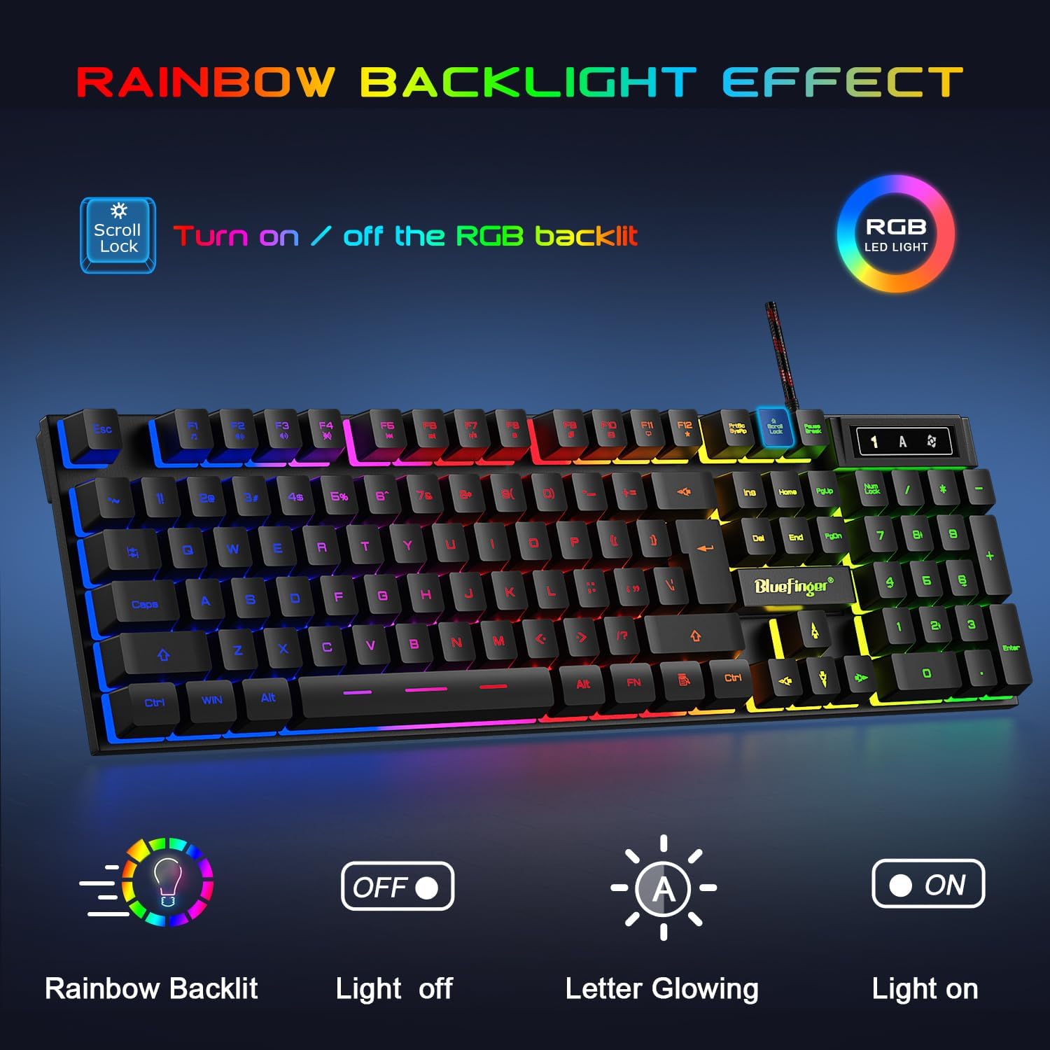 - 【Backlit Gaming Keyboard】: Rainbow backlit keyboard, you can easy turn ON/OFF by pressing “Scroll Lock” key, the Rainbow Backlight can illuminate the letters through the keys, which make it easier for You to type in a dark room. The double-shot injection moulding process ensures that letters never fade and have good light transmission.