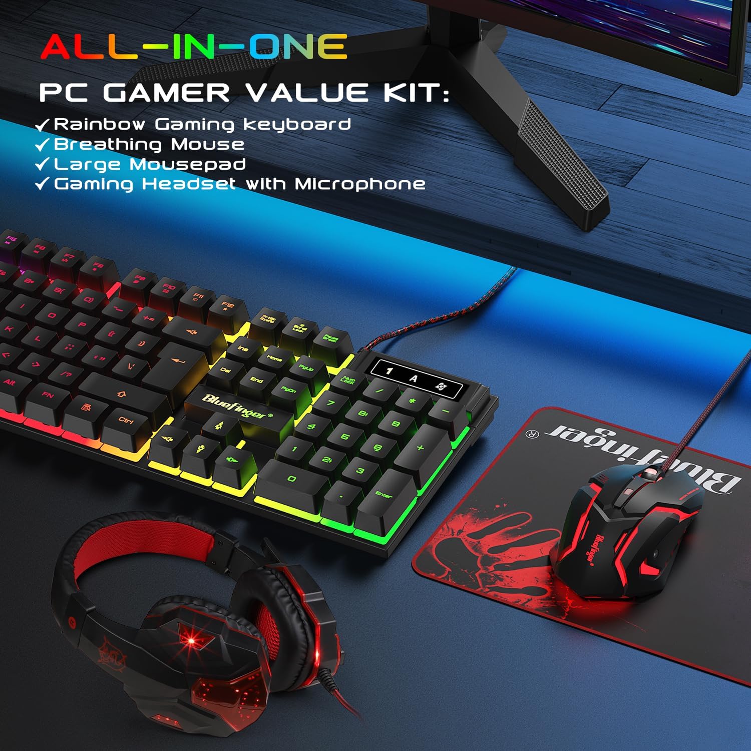 - 【All IN 1 Gaming Bundle】: Includes Bluefinger RGB Backlit Gaming Keyboard and Mouse, red gaming headset, mouse pad. ALL-IN-ONE PC GAMER VALUE KIT, Ideal for beginners, casual gamers, or anyone upgrading their desktop setup.