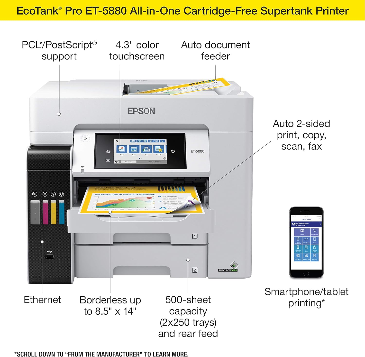 Epson EcoTank Pro ET-5880 Wireless Color All-in-One Supertank Printer with Scanner, Copier, Fax, Ethernet and PCL/Postscript, White
