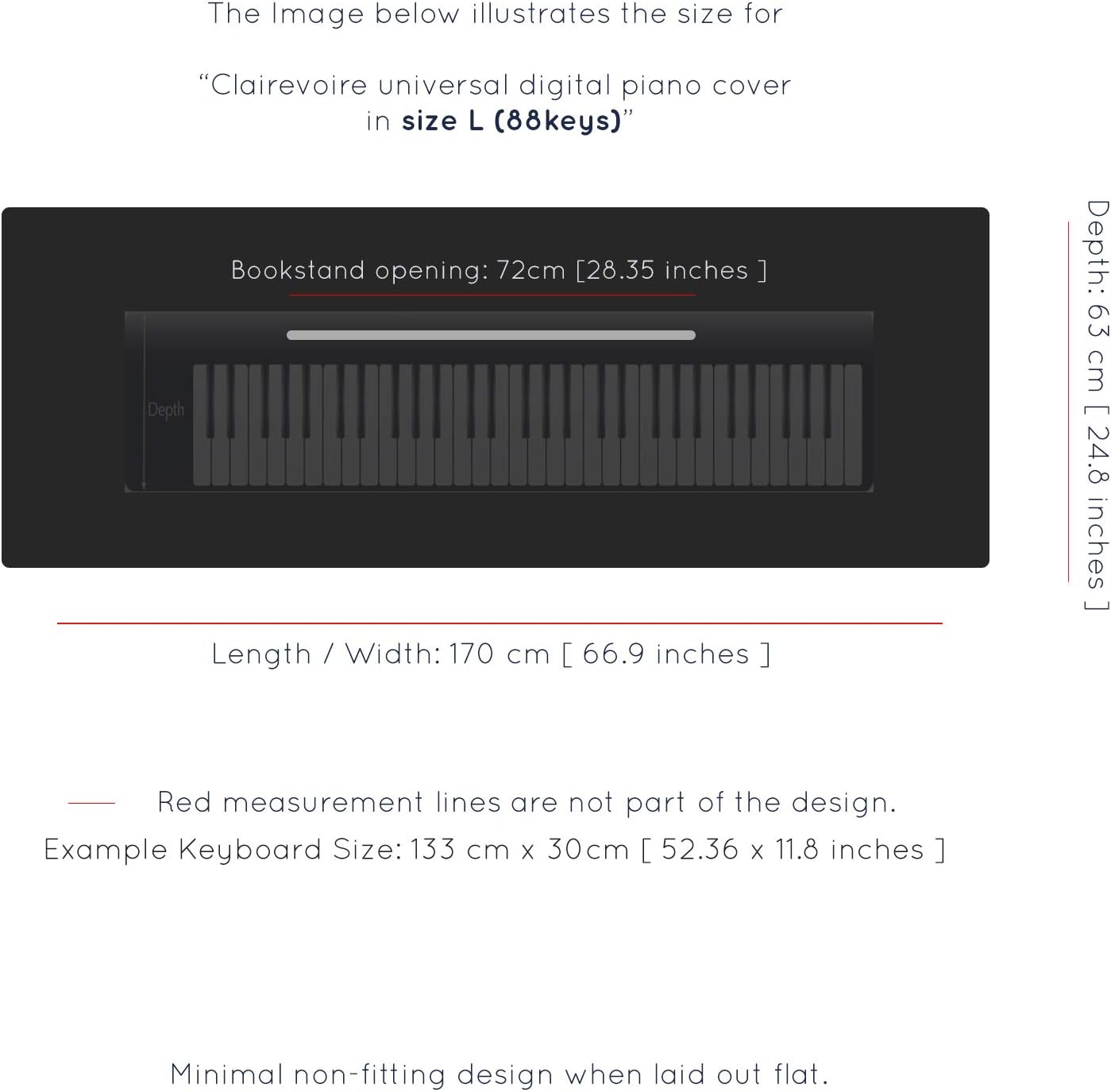 - UNIVERSAL FIT FOR KEYBOARDS AND PIANOS – Our clairevoire piano covers are Carefully made to fit most keyboards, offered in two sizes: M (25 x 59") for up to 88 keys and L (25 x 67") for 88 keys. The design of this keyboard piano cover that fits piano keyboards, digital pianos, and electric pianos, thereby making sure your valuable instrument stays impeccably protected. It is ideal for use as a piano cover for 88 keys or as a piano keyboard dust cover for 61 keys.