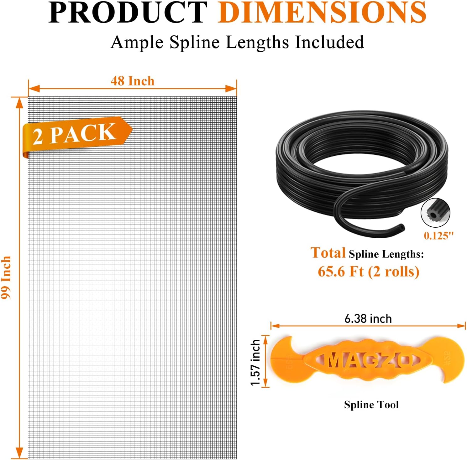 2PACK MAGZO Window&Door Screen Replacement Kit, 48''W x 99''L, with Retainer Spline (Total 65.6 FT) and Press-Fit Roller Tool, Polyester Scratch-Proof, Net Roll Repair for Sliding/House Windows, Black