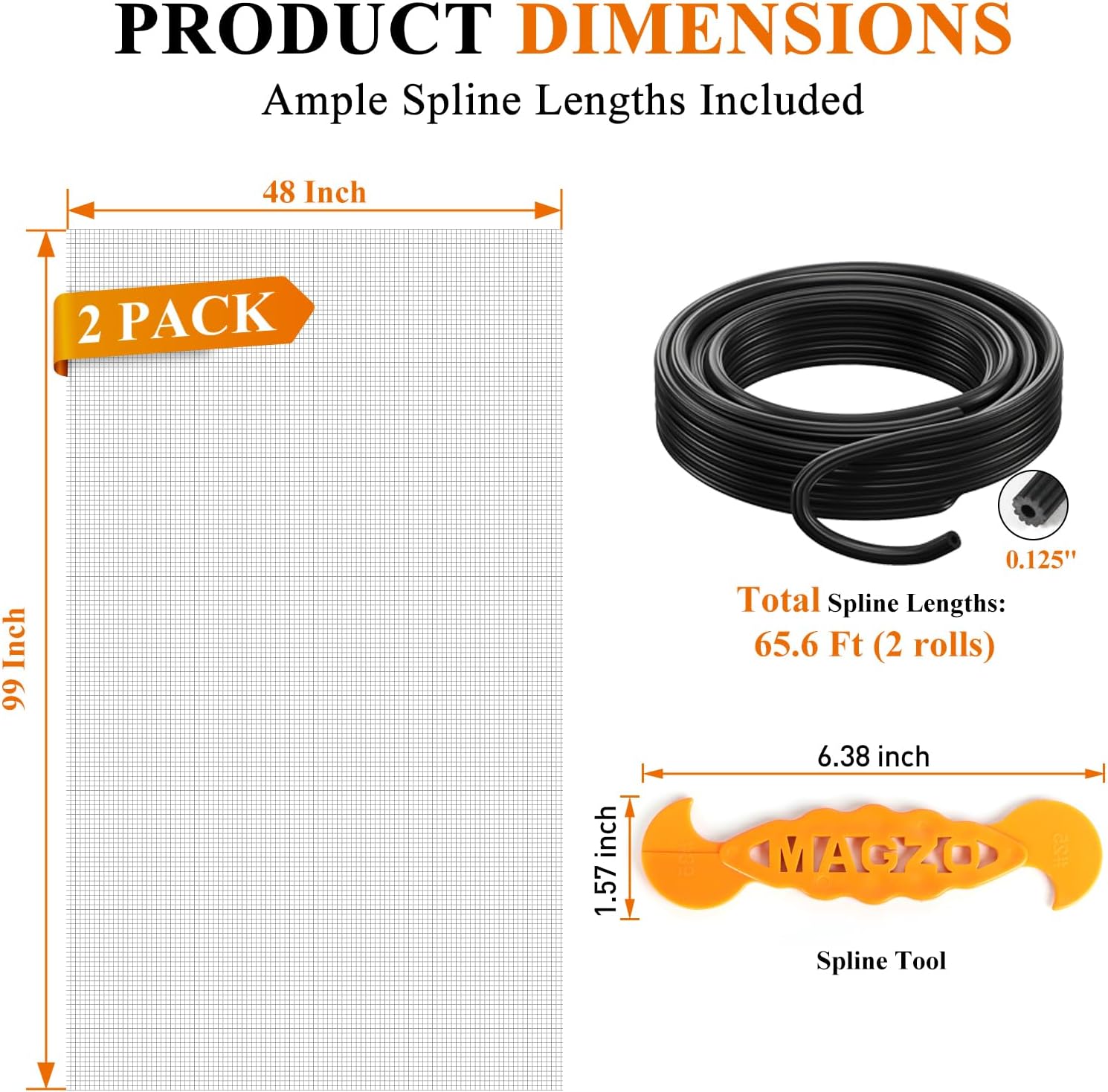 2PACK MAGZO Window&Door Screen Replacement Kit, 48''W x 99''L, with Retainer Spline (Total 65.6 FT) and Press-Fit Roller Tool, Scratch-Proof Polyester, Mesh Roll Repair for Patio, Pet Friendly, Grey