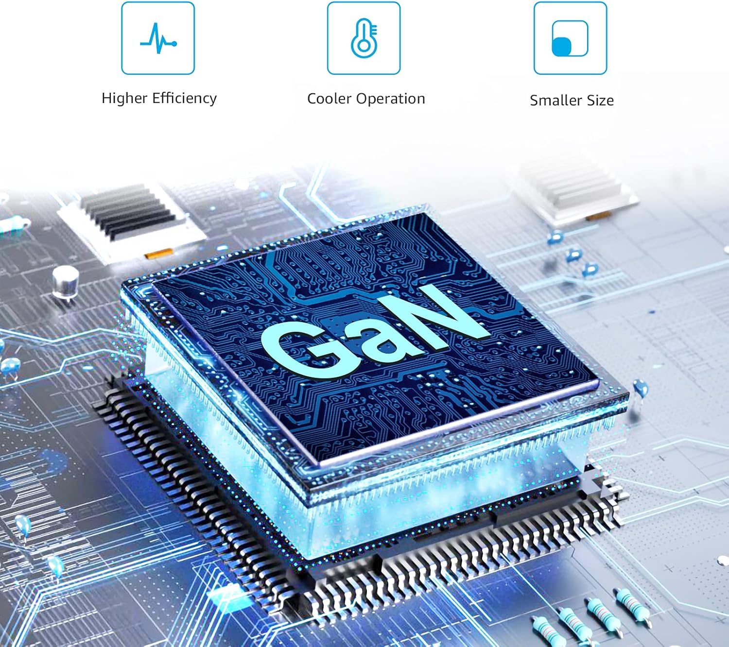 - GaN technology: GaN components waste less power and produce less heat (compared to silicon), which results in a more efficient charge