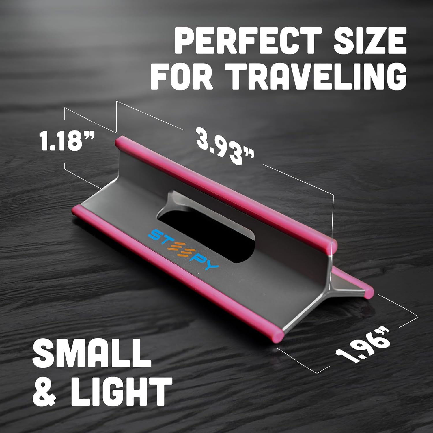 - SETUP'S A BREEZE - Just unfold and go—no screws, no hassle. Instant use, instant time saver! Steepy desk laptop stand is a travel laptop stand made out of strong and durable recycled plastic, with rubber edges to provide the sturdy and stable support your device needs and prevent it from sliding or skidding.