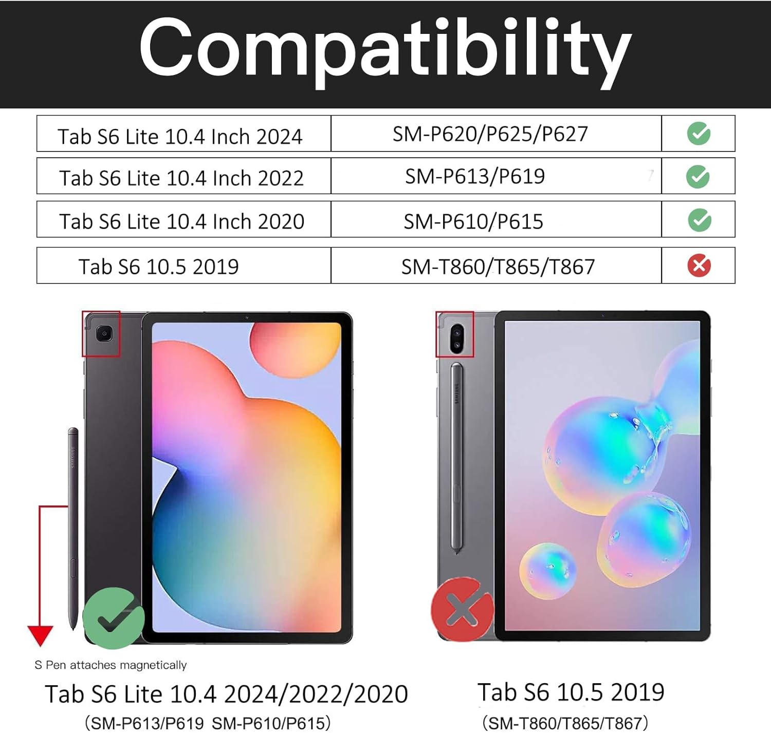 - Compatibility:Only fit for Samsung Galaxy Tab S6 Lite 10.4 Inch 2024/2022/2020 Model:SM-P613/P610/P615/P619 /P620/P625/P627 Tablet, WILL NOT FIT ANY OTHER TABLETS. Please Note:S Pen and screen protector is not included..