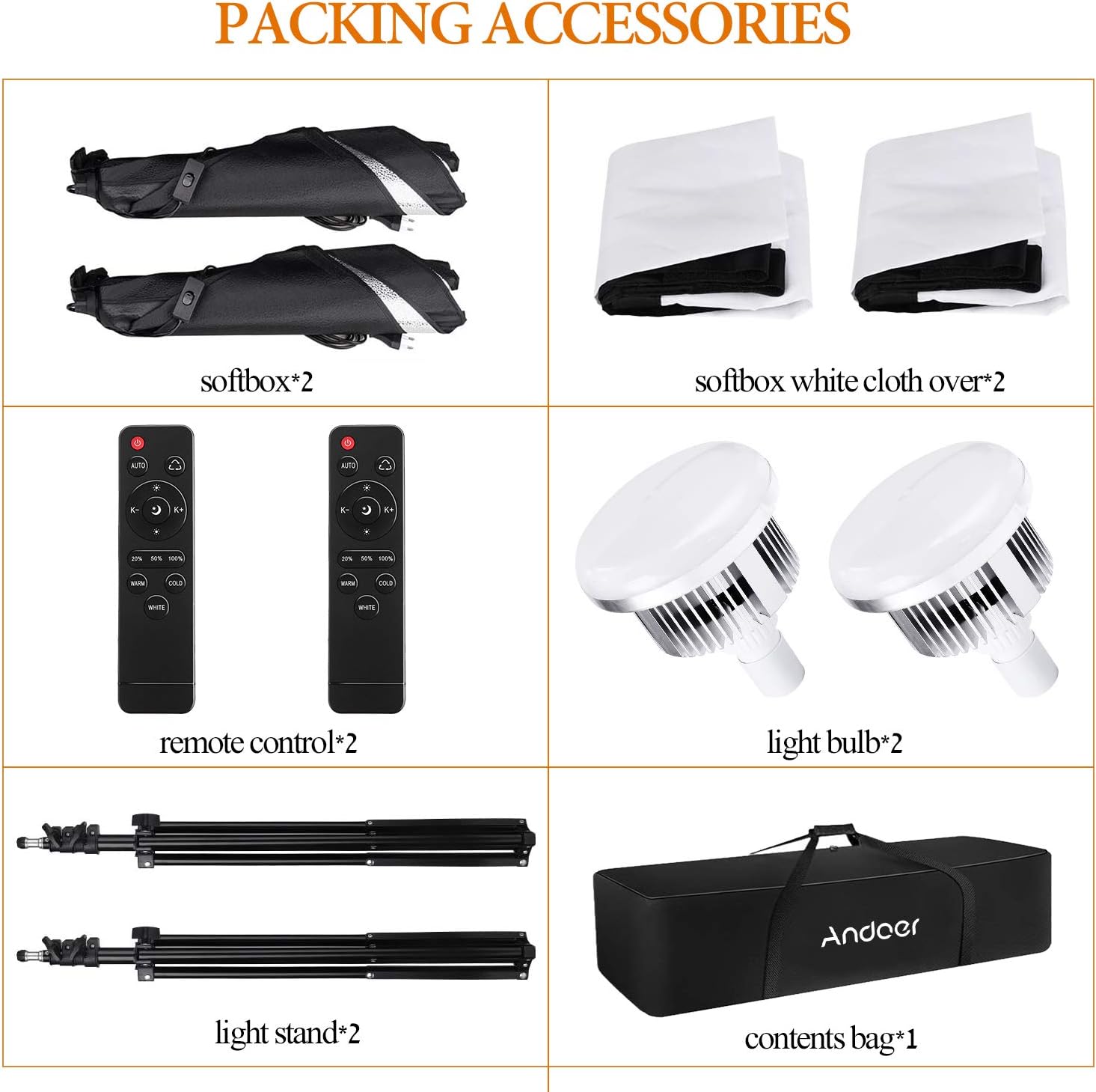 - Professional Studio Photography Light Kit: Including LED light * 2, softbox * 2, light stand * 2, remote control * 2 and carrybag, the photography light kit is perfect for home and studio video recording, live streaming, makeup, portrait and product photography, fashion photo taking, children's photo shooting, etc.