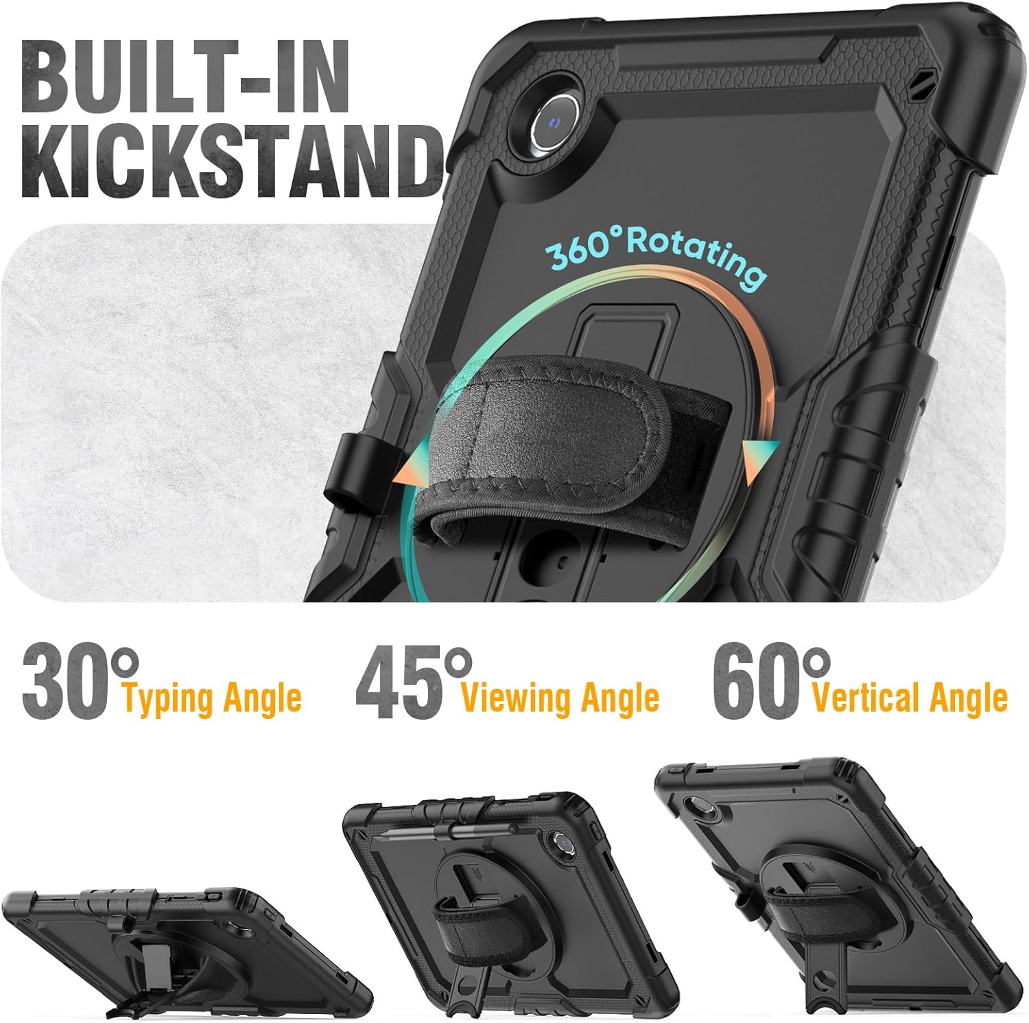 - 360 Rotating Hand Strap & Stand — With adjustable rotating hand strap and stand, you can hold the s6 lite tablet case by one hand and find the most comfortable viewing angle you need. The built-in stand provides a stable supports, with viewing/drawing/typing angles you need, and it can be folded up when not in use.